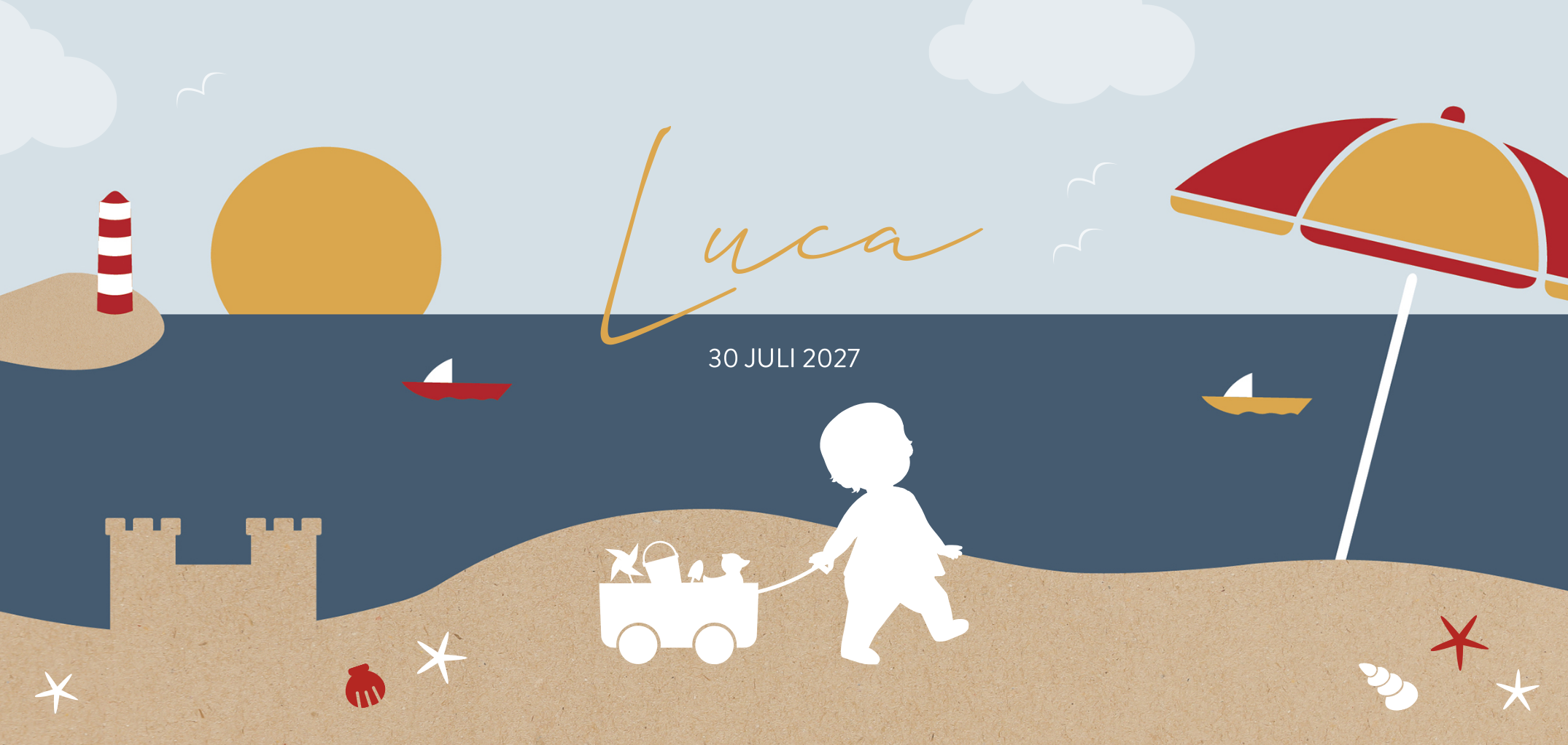 Ben je deze zomer uitgerekend of woon je aan het strand? Dan is natuurlijk superleuk om dit thema terug te laten komen in het geboortekaartje van je zoon. Op de kaart zie je de zon, de zee en het strand met o.a. een parasol en zandkasteel. Liever een ander silhouetje? Neem dan een kijkje tussen de illustraties in de map "silhouet familie". Als de kaart naar wens is, kan je een proefdruk bestellen.