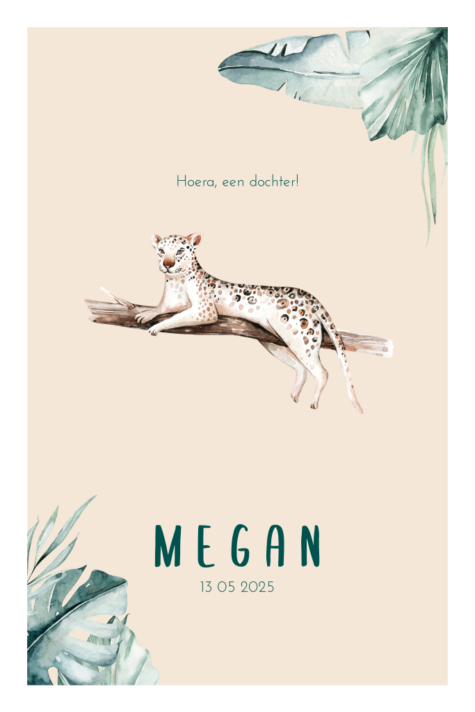 Klassiek beige geboortekaartje met luipaard op een tak en bladeren. Ben je op zoek naar een geboortekaartje met een luipaard maar wil je een ontwerp dat niet al te druk is? Misschien vind je dit ontwerp wel goed passen bij de geboorte van jullie dochter. Het kaartje heeft een creme achtergrond met rustige luipaard op een takje lekker naar de omgeving staart omgeven door grote tropische bladeren. Open de designtool en pas de teksten naar wens aan.