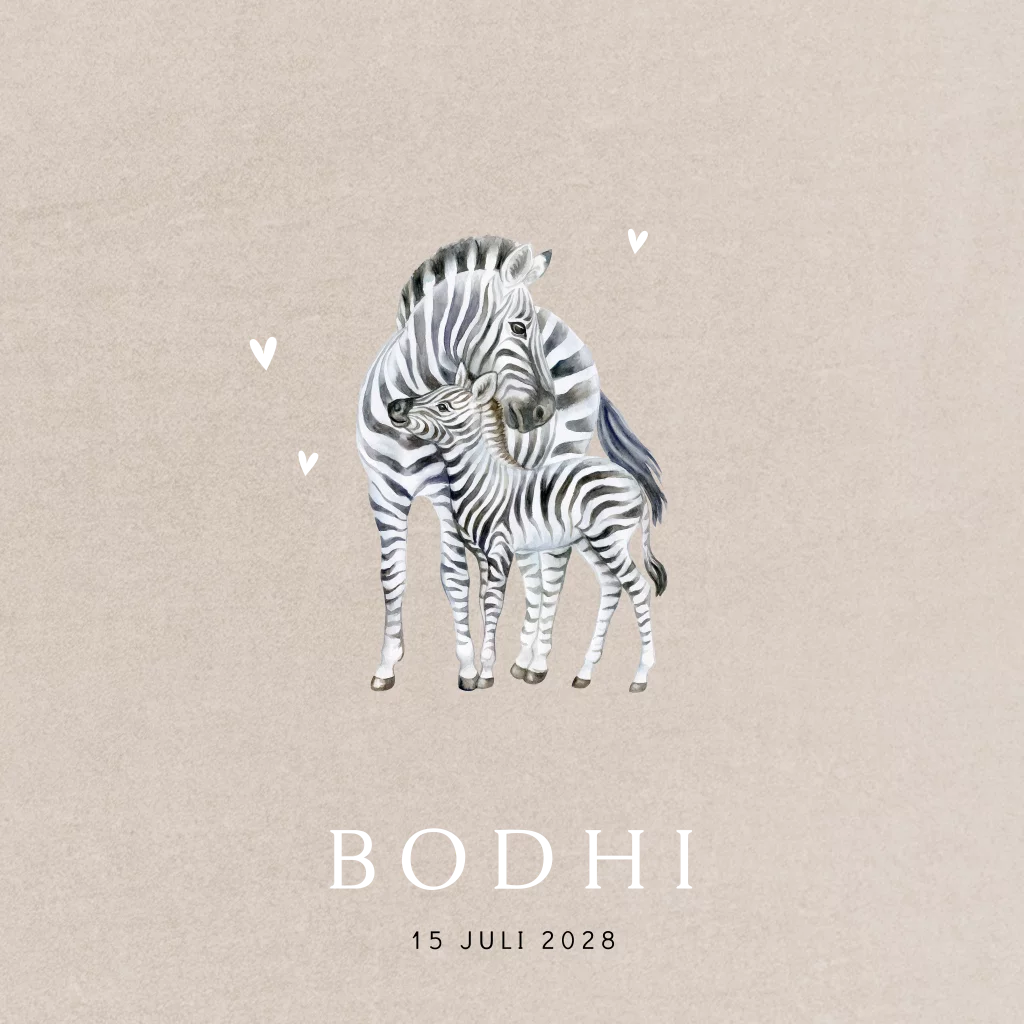 Beige geboortekaartje met waterverf illustratie van een moeder zebra met een baby zebra en de naam in mooi goudfolie. Dit stoere geboortekaartje kan zowel voor de geboorte van een jongen als een meisje. Bestel snel een proefdruk om dit kaartje in het echt te zien!