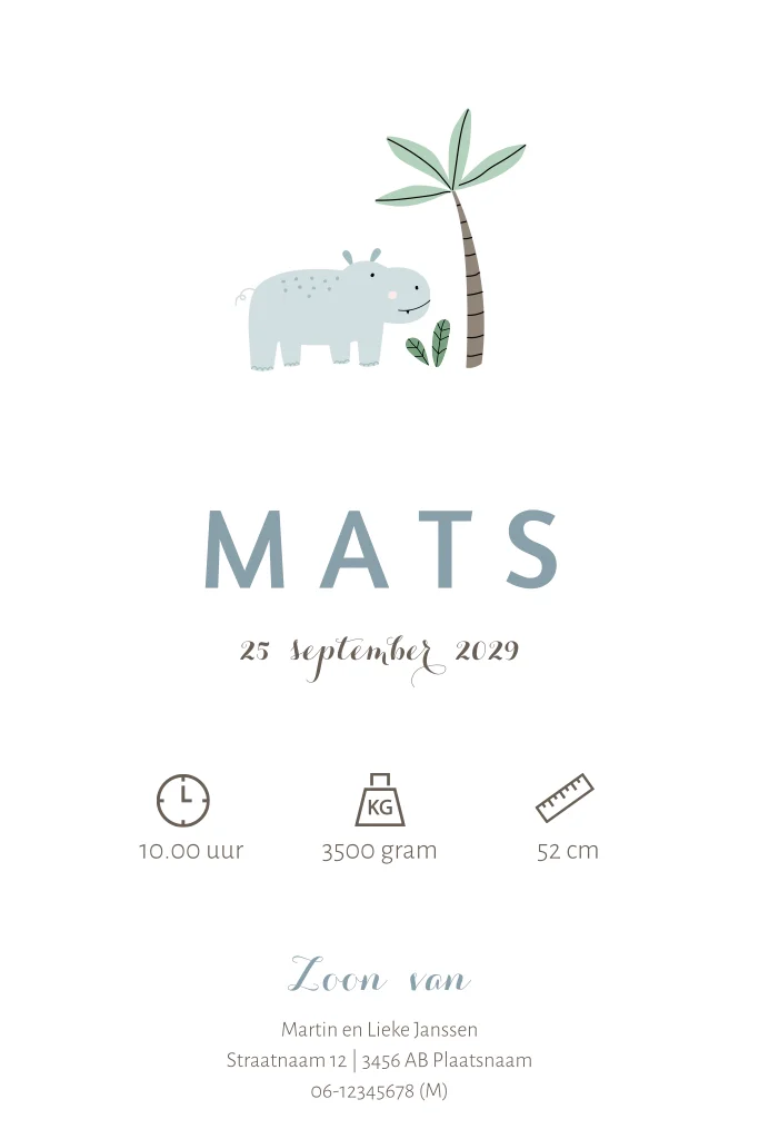 Op zoek naar een hip geboortekaartje met een dierenthema? Dit minimalistische ontwerp met een schattig blauw nijlpaard en palmboom straalt rust en eenvoud uit. De strakke typografie, zachte kleuren en grafische pictogrammen maken dit kaartje modern én tijdloos. Leuk voor ouders die houden van een rustige stijl met een knipoog naar de jungle.