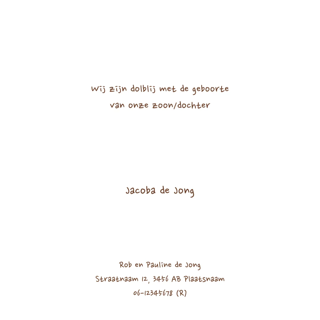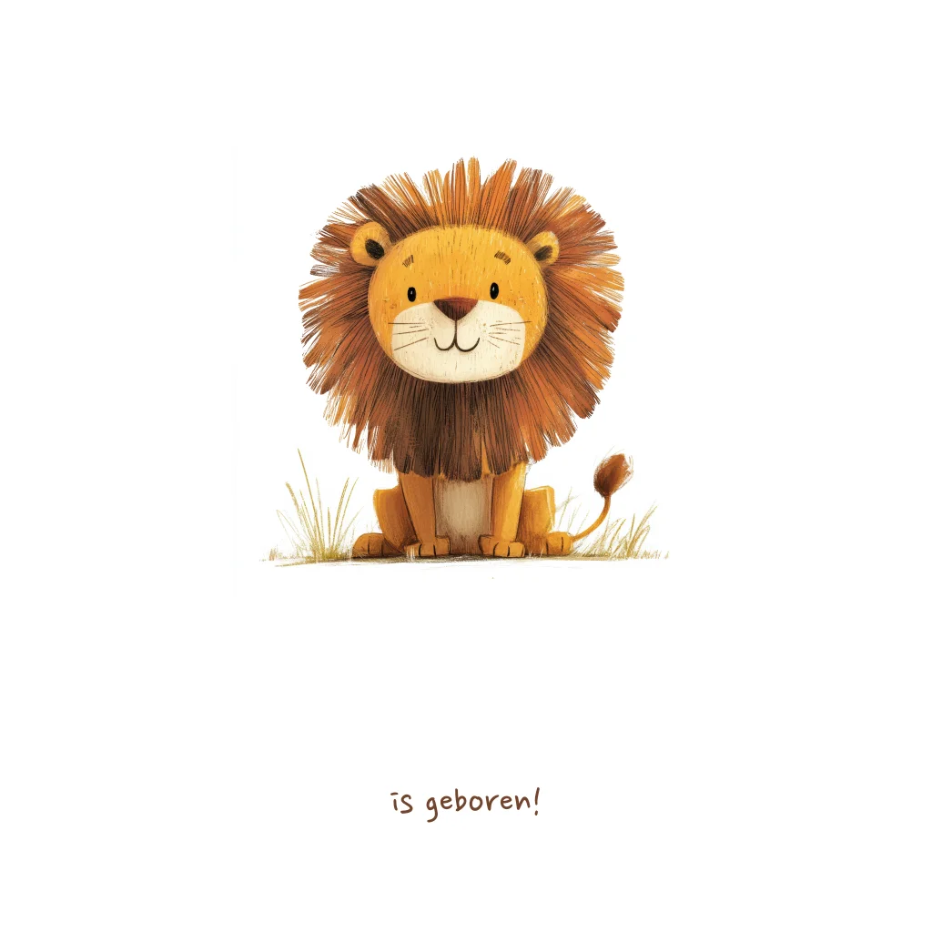 Geboortekaartje met een getekend leeuwtje in warme tinten. Rondom staan kleine hartjes. De naam is gedrukt in goud en valt daardoor goed op. Door de witte achtergrond blijft het ontwerp met leeuw overzichtelijk en eenvoudig. Een mooie keuze voor wie houdt van een dierenkaartje met een subtiel accent.