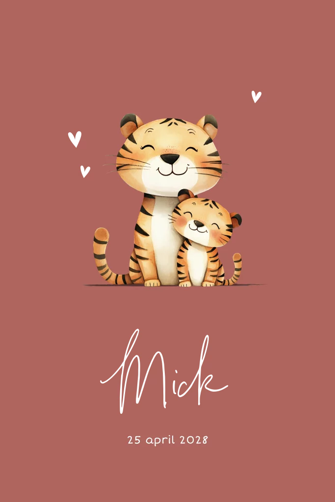 Op zoek naar een bijzonder geboortekaartje jungle? Dit kaartje met een moeder tijger en haar baby is stoer, liefdevol en perfect voor een kleintje dat net zo krachtig en uniek is als de dieren uit de jungle. De warme illustratie spreekt tot de verbeelding en maakt dit kaartje een echte blikvanger. Personaliseer het ontwerp eenvoudig in onze editor en kies je favoriete kleuren, lettertypes en tekst. Een dierenthema dat zowel schattig als stijlvol is!