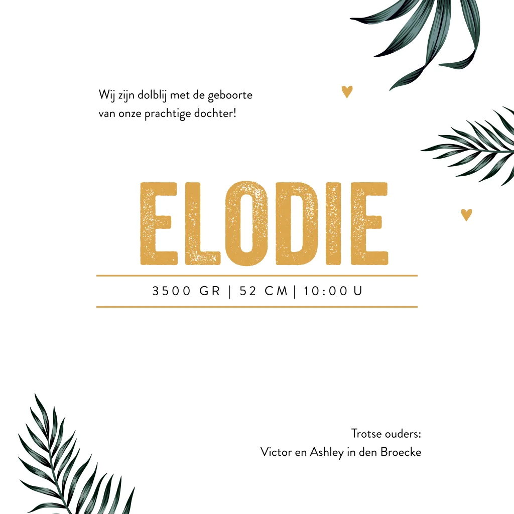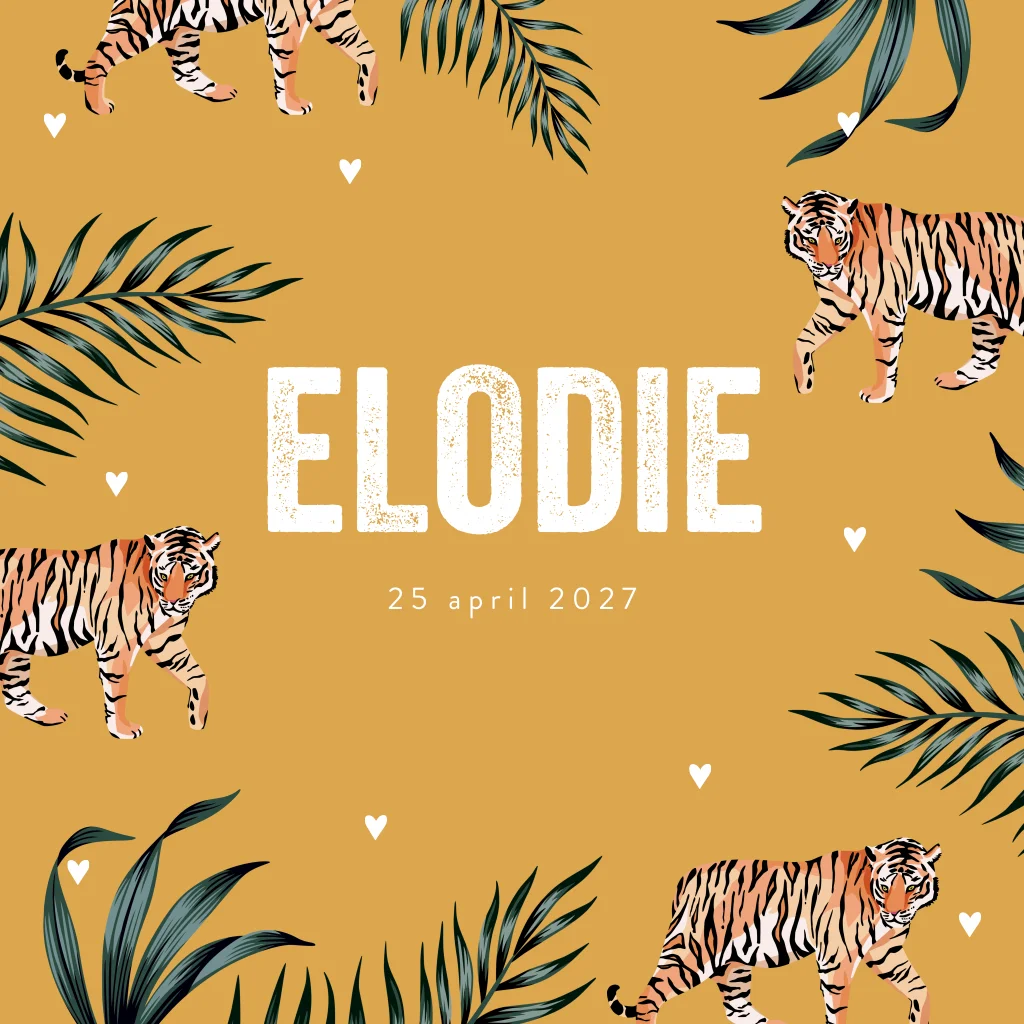 Stoer geboortekaartje met okergele hartjes, tijgers en bladeren. Het jungle thema is helemaal hot! Daarom hebben we dit leuke geboortekaartje met okergele achtergrond aan de collectie toegevoegd. Op de voorzijde zie je een mooi kader met tropische bladeren en stoere tijgers. De witte hartjes dwarrelen rondom de naam. In de ontwerptool kun je het kaartje helemaal naar wens aanpassen. Zo kun je de achtergrond kleur aanpassen, bladeren toevoegen en zelfs extra dieren plaatsen. Zo wordt het één grote beestenboel!