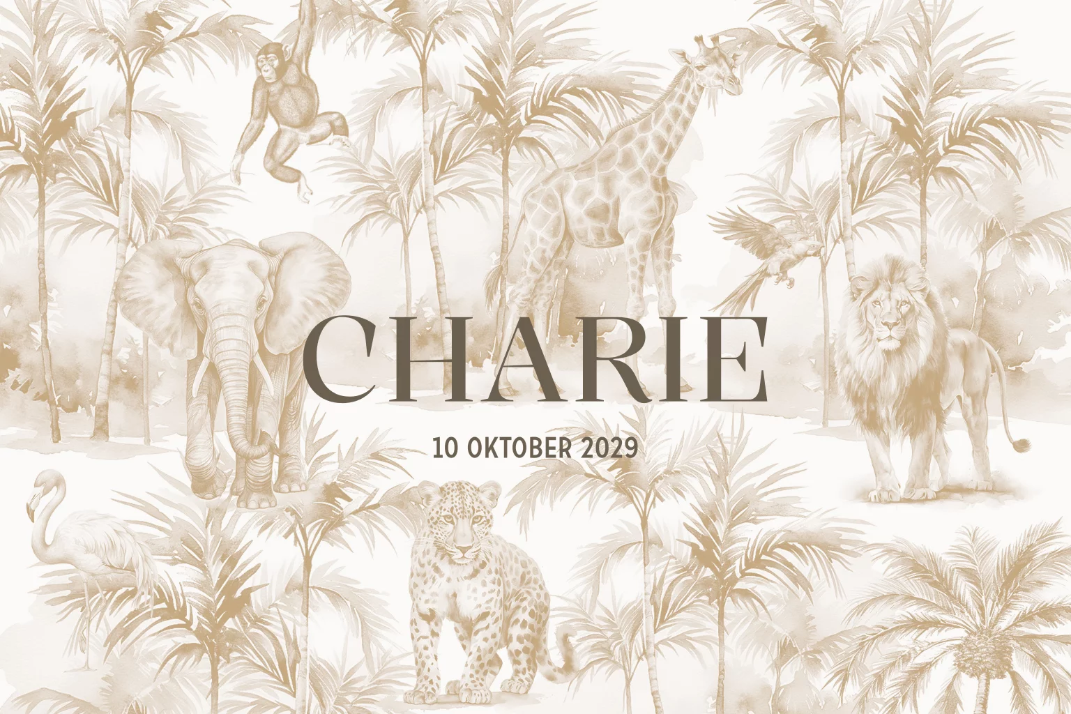 Jungle geboortekaartje in beige met diverse dieren