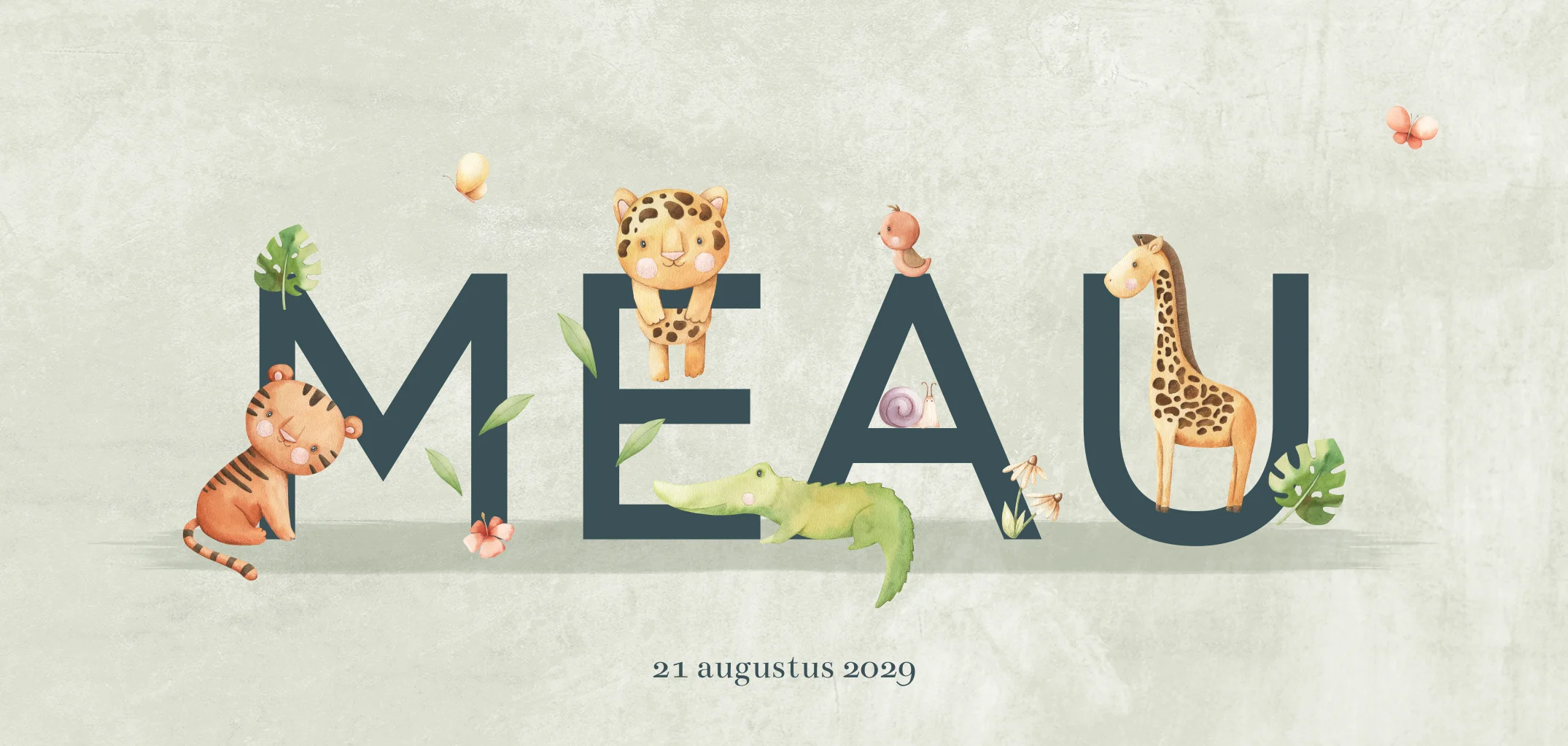 Bekijk ons jungle geboortekaartje, waar de naam van je dochtertje schittert in grote groene waterverf letters. Omringd door speelse junglebewoners zoals een luipaard, tijger, olifant, leeuw, aap en krokodil, naast levendige bloemen en planten. Pas moeiteloos de naam en de dieren aan met onze editor. Bestel een drukproef om deze aankondiging in het echt te zien.