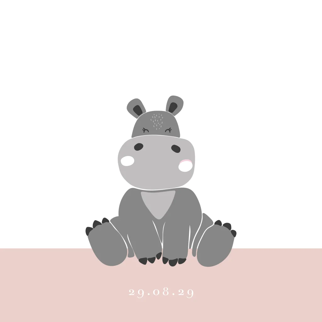 Dit lieve geboortekaartje voor een meisje heeft een schattige illustratie van een nijlpaardje dat vrolijk op het kaartje zit. De naam bovenaan wordt gedrukt in roségoudfolie, net als de hartjes. De zachte kleuren en het roze vlak onderaan zorgen voor een echte meisjeskaart De wangetjes van het nijlpaardje hebben een zacht roségouden accent, wat het kaartje extra lief maakt. Pas eenvoudig de naam en geboortedatum aan en maak zo een persoonlijk geboortekaartje voor jullie dochter.
