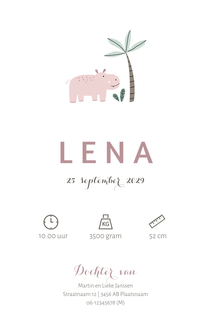 Dit geboortekaartje met een roze nijlpaard is perfect voor ouders die houden van een schattig ontwerp. Het kaartje heeft een rustige, moderne uitstraling met zachte kleuren, een palmboom en leuke pictogrammen voor tijd, gewicht en lengte. Een lieve dierenkaart met een knipoog naar de jungle – helemaal van nu.