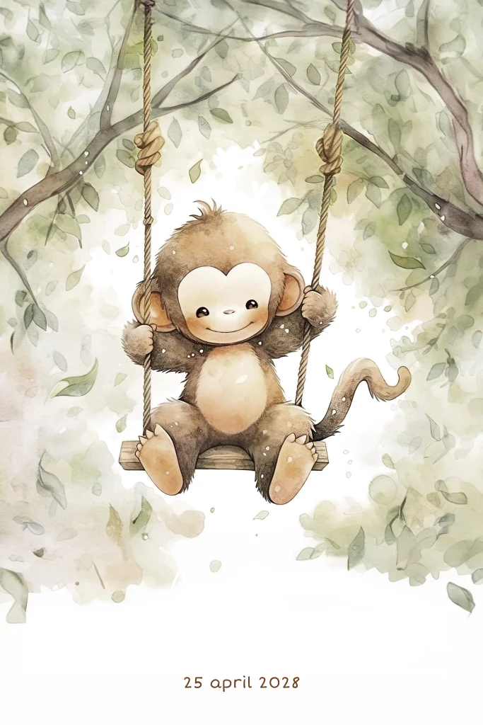 Welkom in de jungle! Dit geboortekaartje met een jungle thema is perfect voor jouw kleintje. Een schattig aapje zwaait vrolijk op een schommel tussen de bomen. De naam van je baby staat in een speels lettertype in blinkende goudfolie. Om het geheel nog mooier te maken, zijn ook de hartjes rondom het aapje in goudfolie gedrukt.