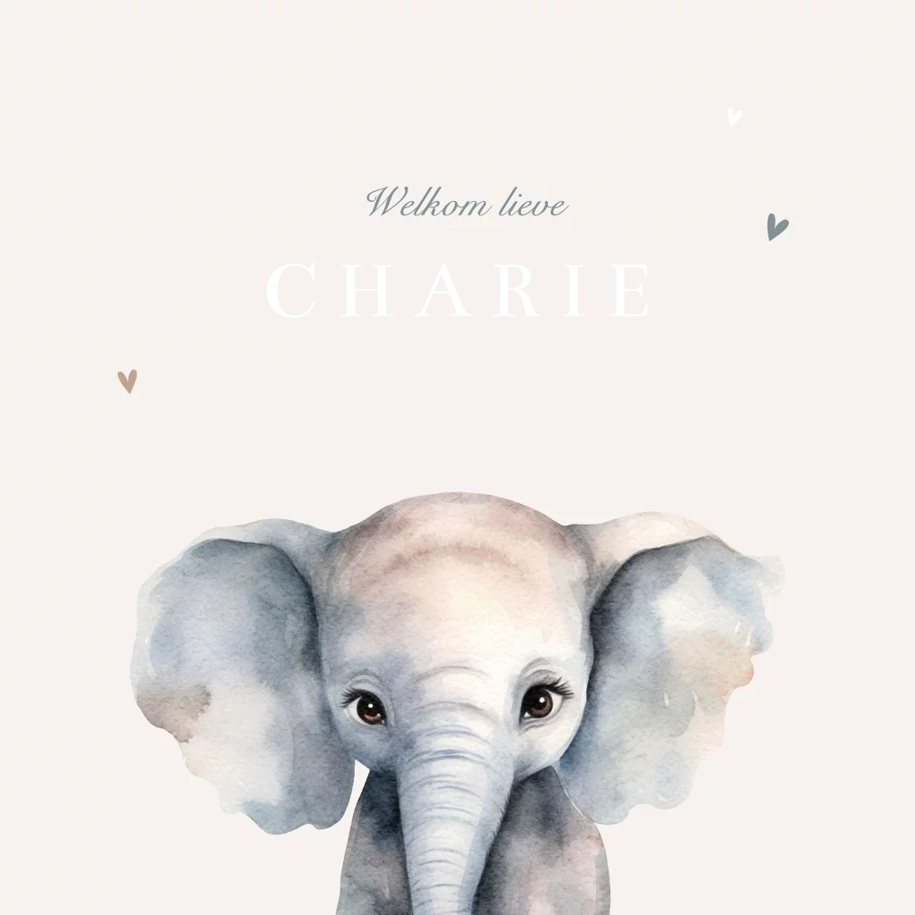 Wil je dit geboortekaartje aanpassen? Het heeft een vierkante vorm en toont een schattige olifant. Boven de olifant staat de naam in regenboogfolie gedrukt. Gebruik de editor om aanpassingen te maken en bestel een drukproef om het eindresultaat te zien voordat je een oplage gaat bestellen.