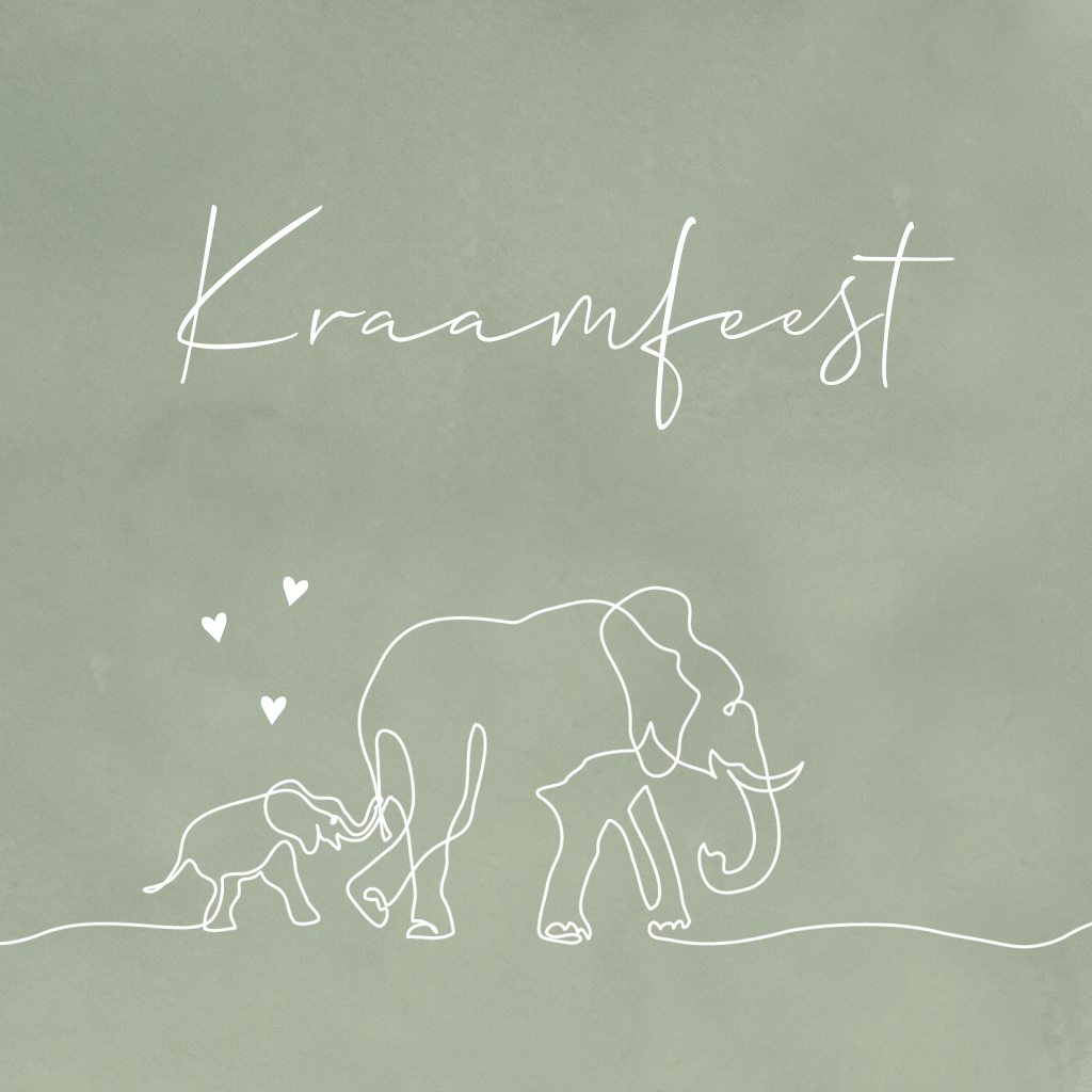 Groen kraamkaartje met lijntekening olifantjes en goudfolie. Oneline tekeningen zijn super hip. Zo ook op dit kraamkaartje wat mooi matcht met het geboortekaartje: 'Goudfolie geboortekaartje met olifantjes in groen'. Verstuur de kaartjes samen in een envelop om iedereen van zowel de geboorte als het kraamfeest op de hoogte te brengen.
