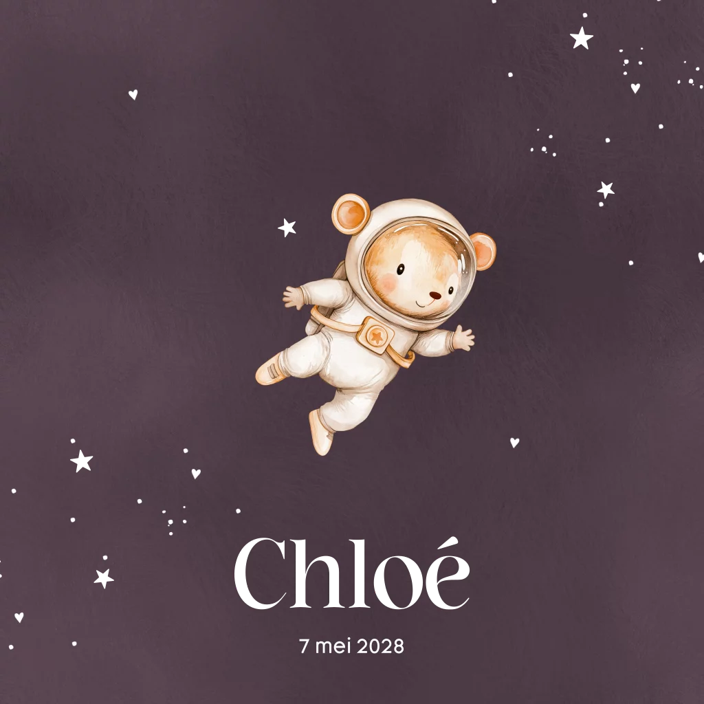 Droom jij van een geboortekaartje dat tot de sterren reikt? Dit avontuurlijke ruimtekaartje neemt je mee op een reis langs de maan, met een schattig beertje in astronautenpak als hoofdpersoon. Een stoere raket siert de achterkant, terwijl binnenin een mysterieuze planeet wacht — een heel universum verpakt in één kaartje.