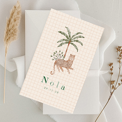 Verwelkom je kleine cheeta met dit prachtige beige geboortekaartje. Een getekende cheeta siert de voorkant, omringd door tropische planten. Op de achtergrond geven subtiele ruitjes een speels tintje. De naam van je kindje schittert in glanzend donkergroene hoogglans, waardoor dit kaartje een blijvende herinnering wordt aan dit bijzondere moment. Pas de kleuren, lettertypes en hoogglanskleur zelf aan in onze handige editor.