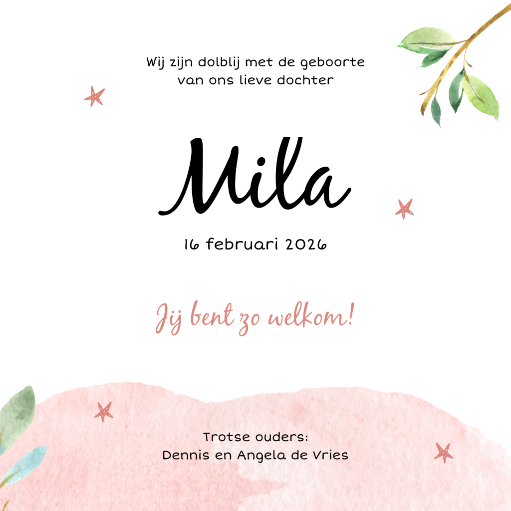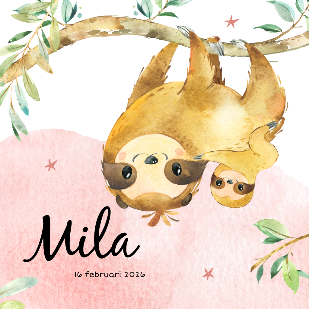 Botanisch geboortekaartje met luiaard met baby girl en sterretjes. Schattig geboortekaartje met roze waterverf. Op de voorzijde staat een mooie illustratie van twee luiaards aan een boom. De kaart is versierd met kleine sterren. Met een hip lettertype staat de naam van je pasgeboren dochter voorop de kaart. In de kaart is ruimte voor een mooie oneliner en alle geboortegegevens.