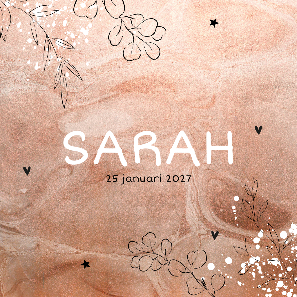 Chique geboortekaartje met in roze marmer gewolkte achtergrond. De takjes geven de kaart een botanisch tintje. Dit meisjeskaartje is verder versierd met sterretjes en hartjes. Met hippe letters staat de naam van je dochter centraal op de kaart. Bestel een drukproef (op parelmoer / metallic) om een exemplaar in het echt te zien.