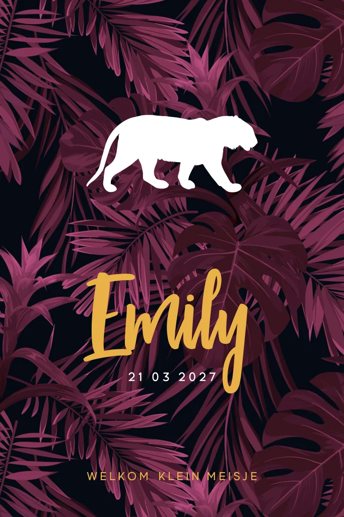 Botanisch geboortekaartje met witte silhouet van een tijger. Mooi geboortekaartje met een donkerrode bladeren achtergrond. De witte silhouet van de tijger komt mooi uit op de donkere kleur. Wil je een ander dier? Kijk eens in de designtool bij de illustraties onder silhouetten, hier staan nog heel veel andere dieren die je kunt plaatsen.
