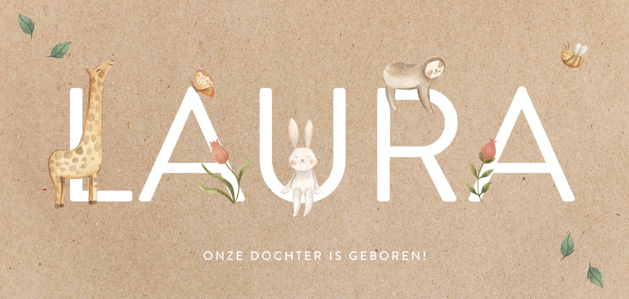 Vrolijk kraft geboortekaartje meisje met groot de naam omgeven door dieren. Ben je in verwachting van een dochtertje en nog op zoek naar een schattig babykaartje? Wellicht wordt je heel enthousiast van dit vrolijke design met giraf, konijn, leeuw, vlinder en diverse bloemetjes. Je kunt zelf de naam bewerken in de tool en de dieren verschuiven of wisselen. Dit geboortekaartje kun je eenvoudig zelf maken met de designtool. Klaar? Bestel een drukproef.