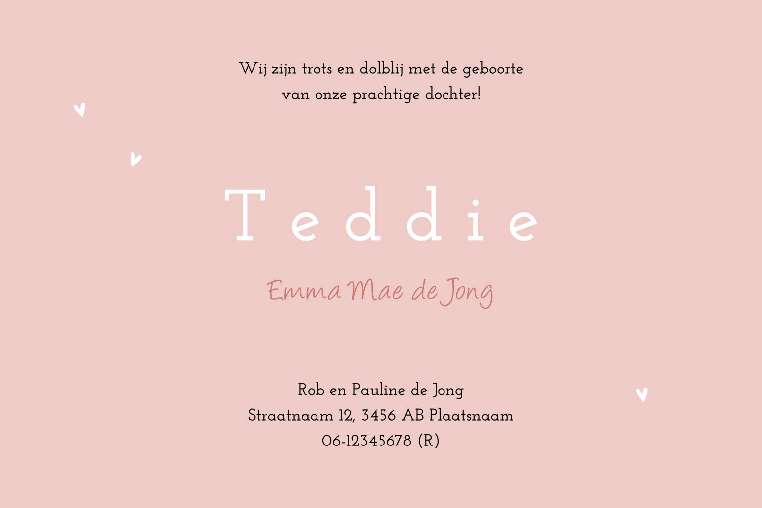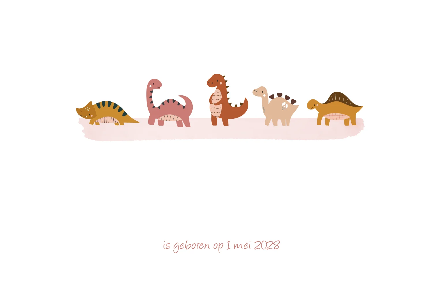 Op zoek naar een geboortekaartje met dino's voor je aanstaande dochtertje? Ga voor dit lieve ontwerp met kleine dinosauriërs en koperfolie. Aan de binnenzijde komen de dino's terug en kun je alle geboortegegevens van je dochter plaatsen. Pas dit vrolijke geboortekaartje zelf aan in onze editor en bestel een proefdruk.