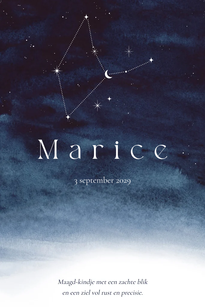 Donkerblauw geboortekaartje meisje met sterrenbeeld maagd