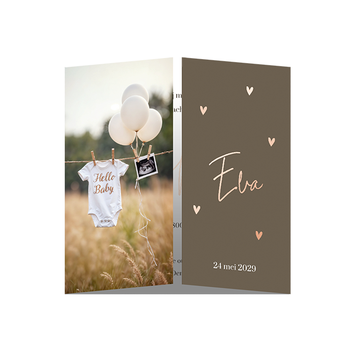 Origineel geboortekaartje in luikvouw met een warme, bruine achtergrond en roségoudfolie accenten. De buitenkant toont links een mooie persoonlijke foto (in de editor rechts) en rechts de naam van jullie dochter in glanzende roségoudfolie (in de editor links), omringd door lieve hartjes. Binnenin is ruimte voor een extra foto, de geboortedetails en een korte tekst. Een chique en eigentijdse kaart met een zachte uitstraling. Volledig te personaliseren in de editor.