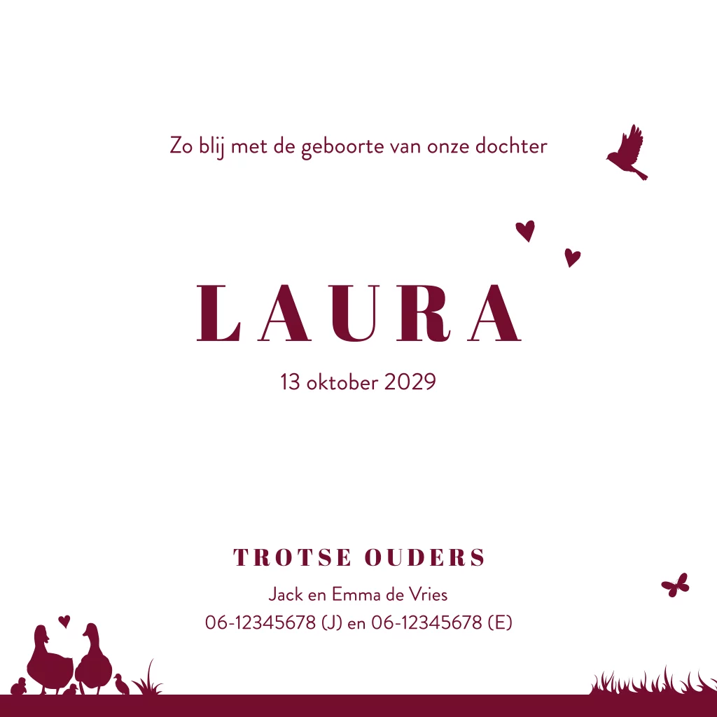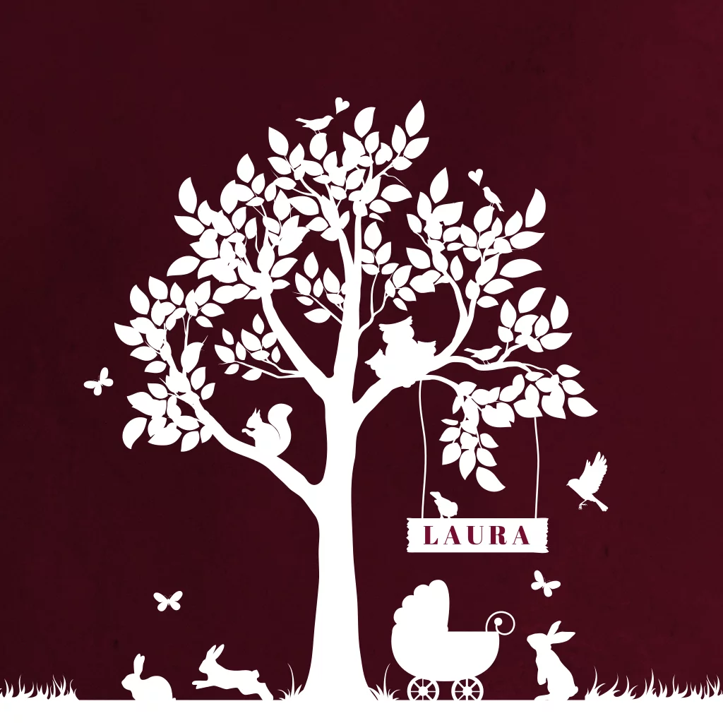 Donkerrood geboortekaartje met wit silhouet kinderwagen onder een boom. In het gras huppelen konijntjes in de boom zit een uil en eekhoorn. Aan de boom hangt een bordje en daarop kan je de naam van je dochtertje zetten. Pas de kleuren naar wens aan en bestel een proefdruk om de kaart in het echt te bekijken.