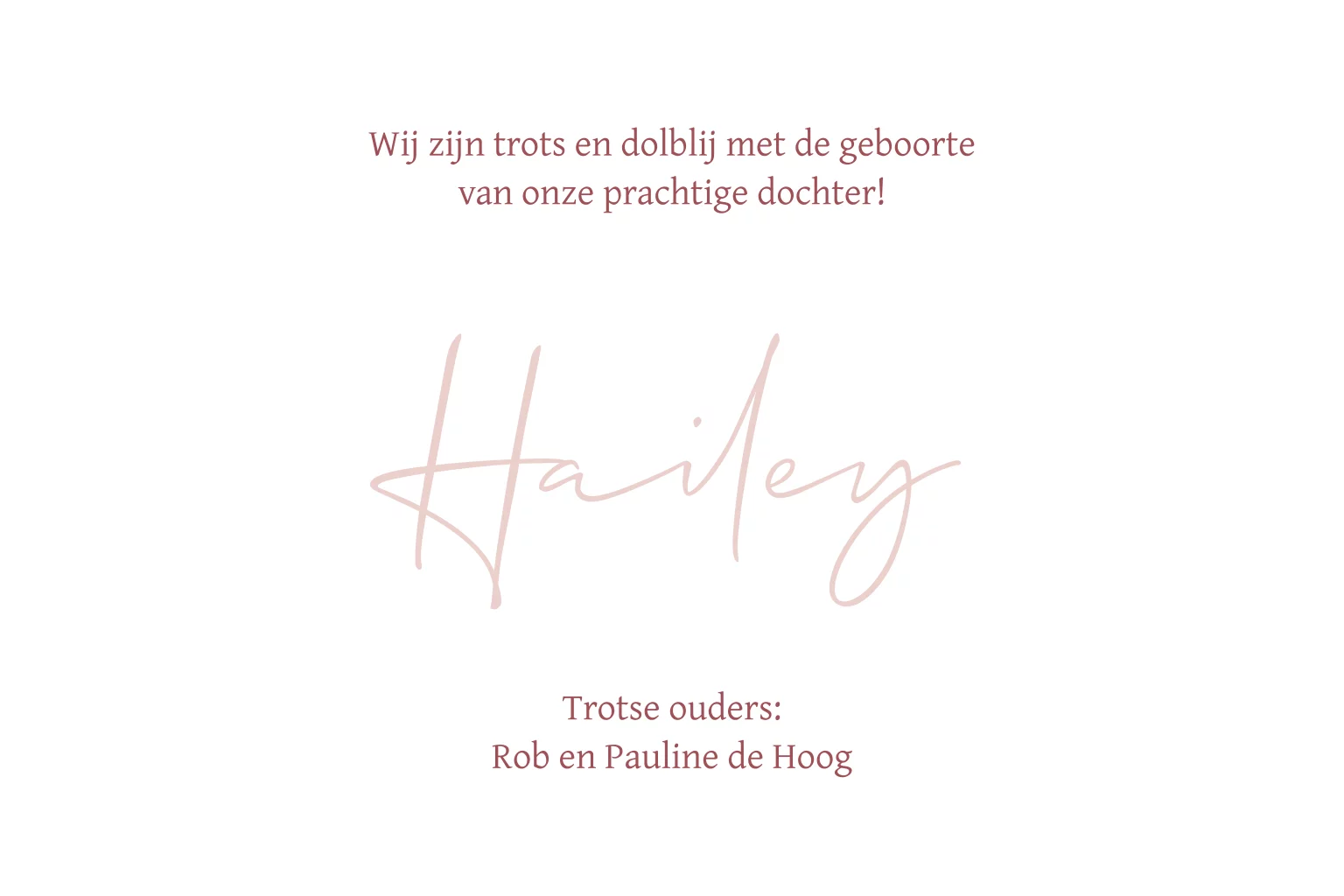 Lief geboortekaartje voor je dochtertje in donkerroze kleur, met geschilderde roze bloemen en sierlijke naam. Een mooi kaartje om de komst van je kleine meid mee aan te kondigen! Liever een ander lettertype? Pas dit kaartje geheel naar eigen wens aan in onze editor.