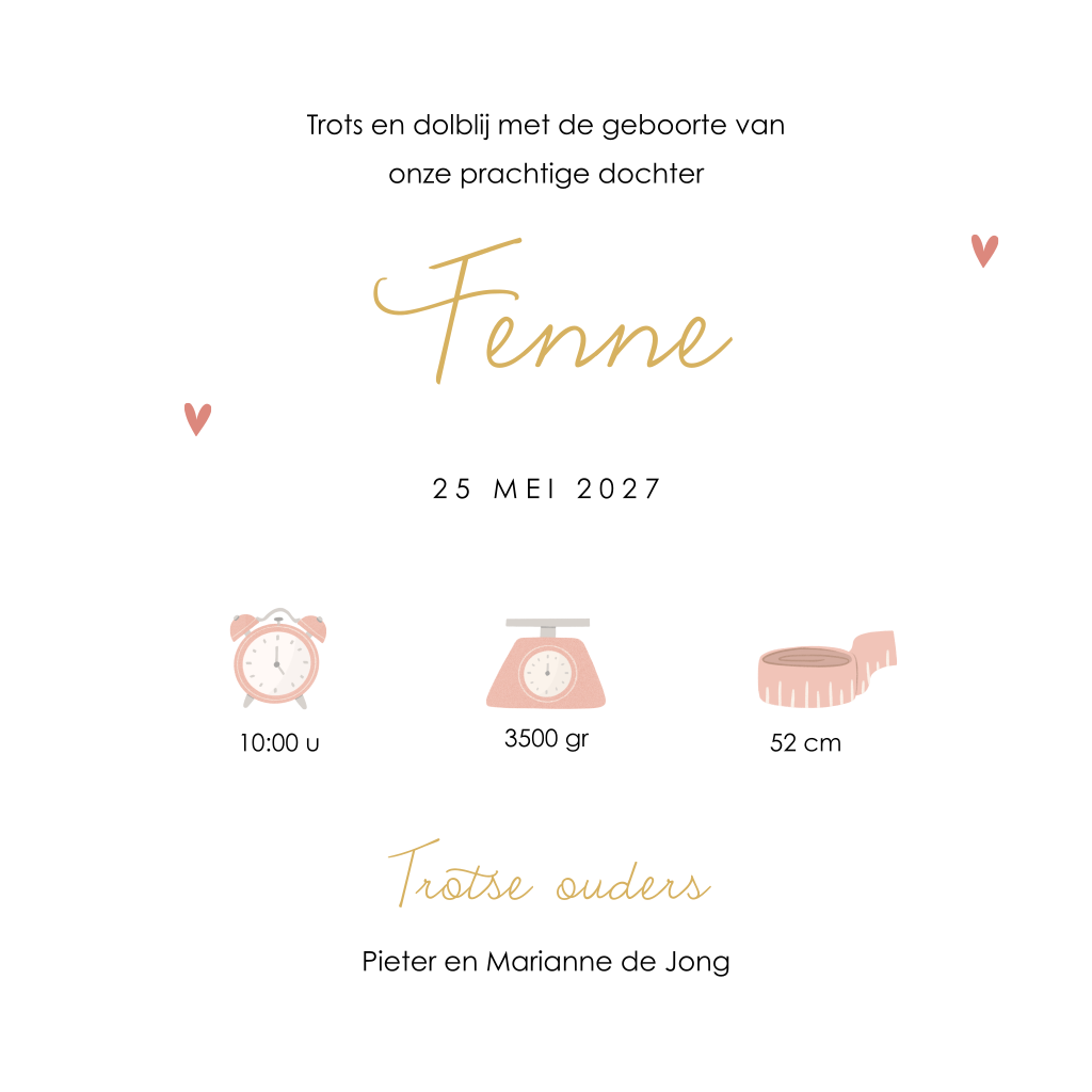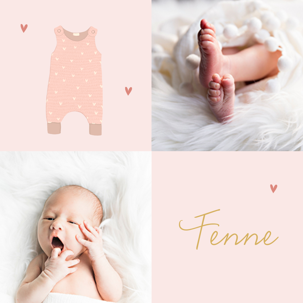 Lief geboortekaartje voor de geboorte van jullie dochtertje. Op de voorkant staan twee foto's die je zelf kunt uploaden en een leuke tekening van een zachtroze rompertje. In het onderste vakje kun je de naam plaatsen of een andere tekst. Pas de kaart naar wens aan in onze tool en bestel een proefdruk.