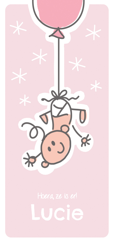 Hoera, het is feest want er is een baby meisje geboren in jullie gezin. Dit vrolijke geboortekaartje met baby meisje hangend aan een roze ballon is perfect om rond te sturen. Op deze geboortekaart zie je een baby meisje met haar luier aan een ballon hangt zwevend tussen sterretjes. Pas de lettertypes gemakkelijk aan in onze editor en creëer een persoonlijk geboortekaartje.