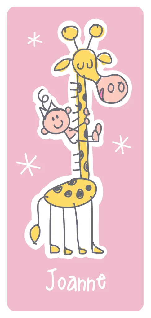 Vrolijk geboortekaartje met een meisje zittend op de nek van een giraf. Op het kaartje zie een baby meisje op de nek van de giraf zitten. De kaart heeft een roze achtergrond met een paar sterren. De sterren keren terug op de achterkant van de kaart. Hier is ook genoeg ruimte voor alle informatie en gegevens van je dochter.