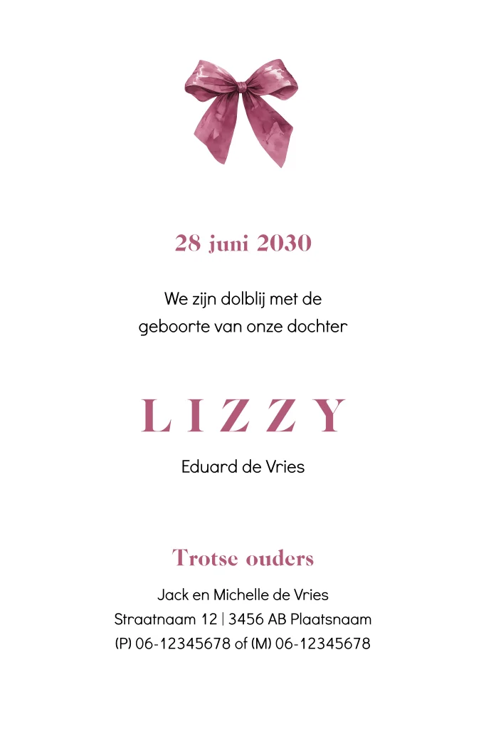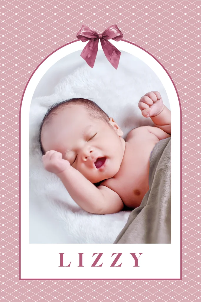 Geboortekaart met een opvallend ontwerp: een grote foto in boogvorm, een oudroze strik bovenaan en een grafisch ruitpatroon rondom. De naam staat duidelijk onder de foto in een bijpassend lettertype. Een kaart met een uitgesproken, stijlvolle look.
