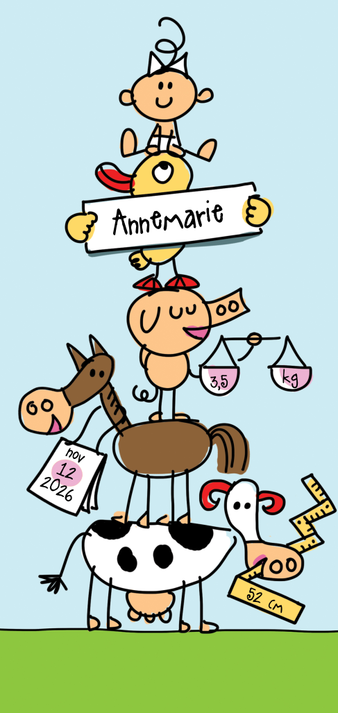 Langwerpig geboortekaartje met vrolijke boerderijdieren die gestapeld op elkaar staat met op de top een baby meisje. Van onder naar boven een koe, paard, varken, eend en bovenop een kleine blije baby. Een vrolijk en kleurrijk geheel om de komst van je dochter mee aan te kondigen. De lettertypes kun je eventueel naar smaak aanpassen in onze ontwerptool.