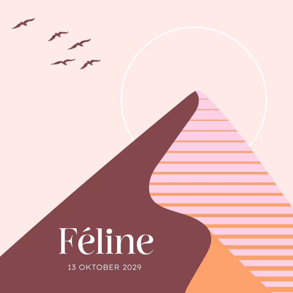 Meisjes geboortekaartje met zonsondergang achter een hoge berg en een zwerm vogeltjes. In de editor kun je dit kaartje helemaal naar eigen wens aanpassen. Dus zowel de kleuren van de berg als alle teksten.