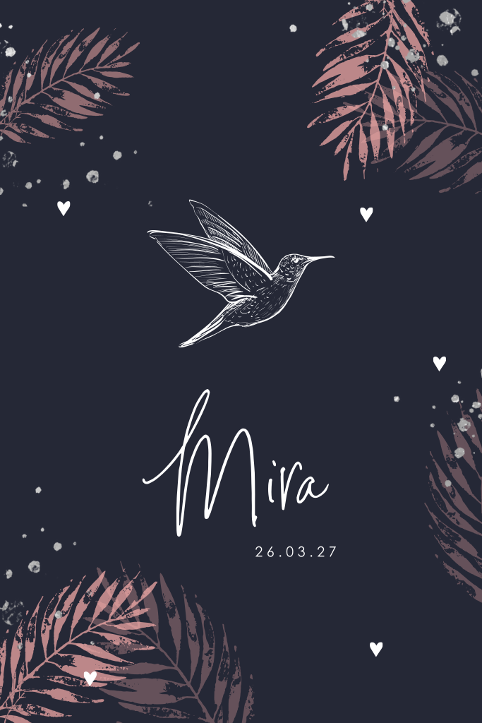 Dit donkerblauwe geboortekaartje met kolibrie is ook geschikt voor de geboorte van jouw dochtertje. De roze en zilverkleurige accenten geven het kaartje alsnog een zachte uitstraling. Het ontwerp wordt omrand door bladeren, hartjes en spetters. Onderaan staat de naam van je dochtertje met speelse typografie. Je kunt in de ontwerptool de kaart helemaal naar wens maken. Verander bijvoorbeeld illustraties, kleuren en/of lettertypes.