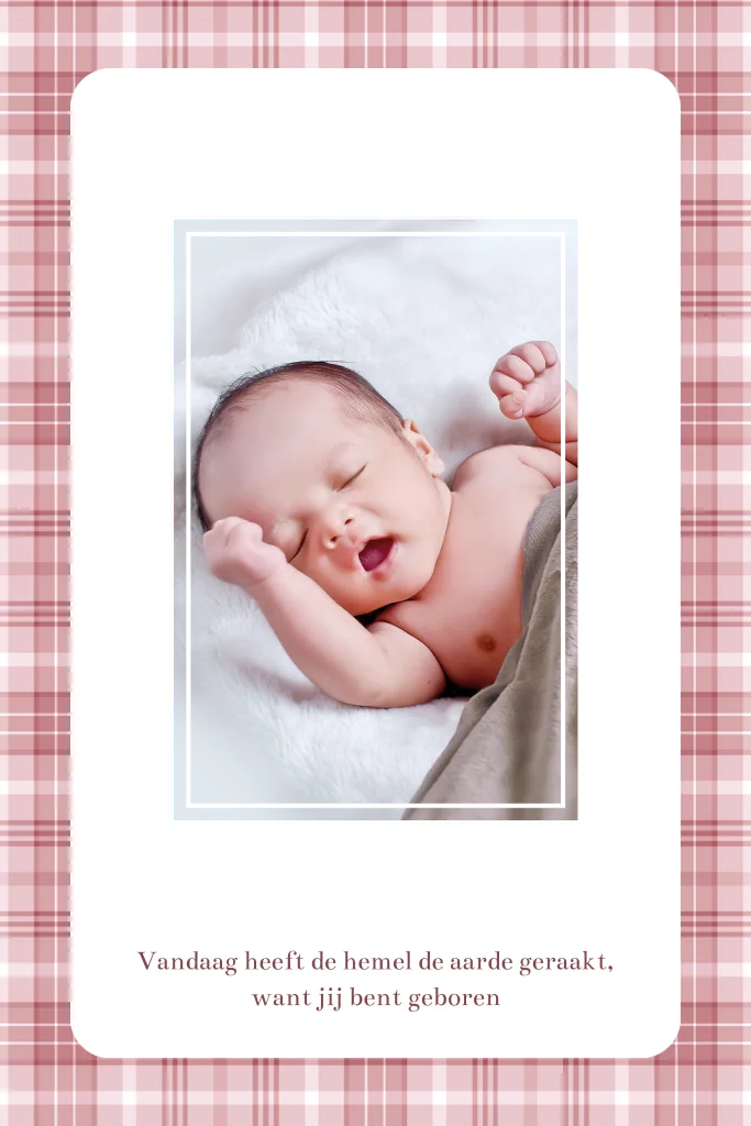 Stijlvol geboortekaartje met een warme roze ruitrand, afgeronde hoeken en een grote foto centraal in een dubbel roségouden kader. De naam staat in een mooi handgeschreven lettertype. Onderaan is er ruimte voor een korte tekst of quote, zoals op dit voorbeeld. Pas de kaart eenvoudig naar wens aan.