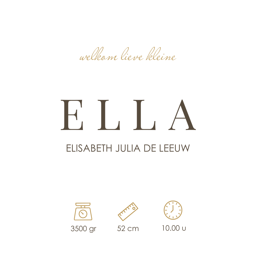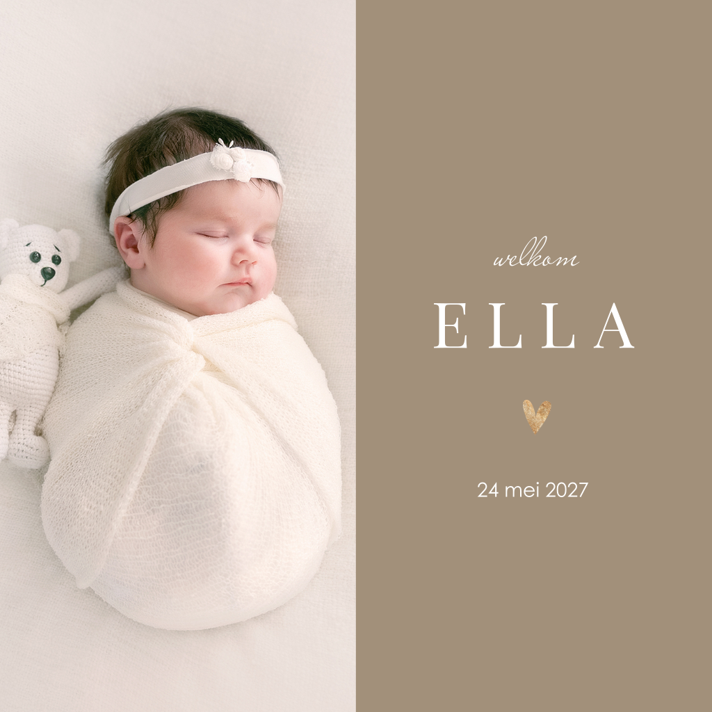 Verliefd op trends en minimalisme? Kies voor dit stijlvolle geboortekaartje. De kaart heeft een beige kleurige achtergrond. Het goudkleurige hartje maakt het ontwerp helemaal af. Sierlijke en strakke lettertypes wisselen elkaar af en dat zorgt voor een speelse uitstraling. Vervang de foto en personaliseer de teksten.