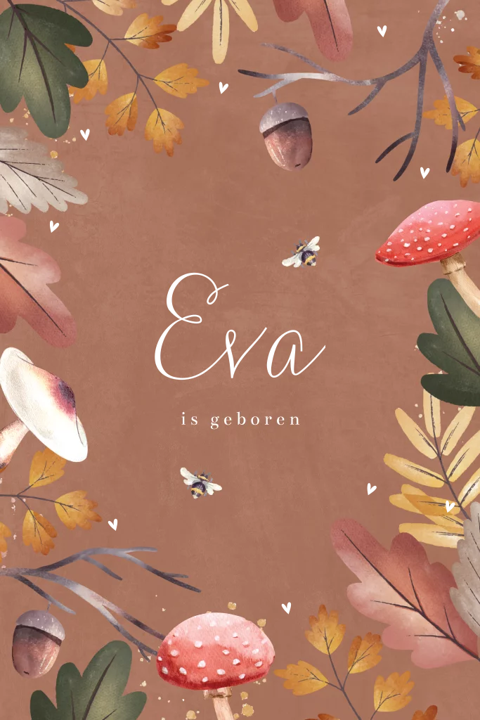 Verwacht je dat je dochter deze herfst geboren wordt? Breng haar geboorte onder de aandacht met dit prachtig geboortekaartje in een warme bruine tint, met paddestoelen, herfstbladeren en de naam in koperfolie. De zwevende bijtjes en kleine hartjes voegen een perfecte finishing touch toe aan dit ontwerp net als de afgeronde hoeken (deze kun je ook uit zetten). Personaliseer dit ontwerp naar wens in onze editor.