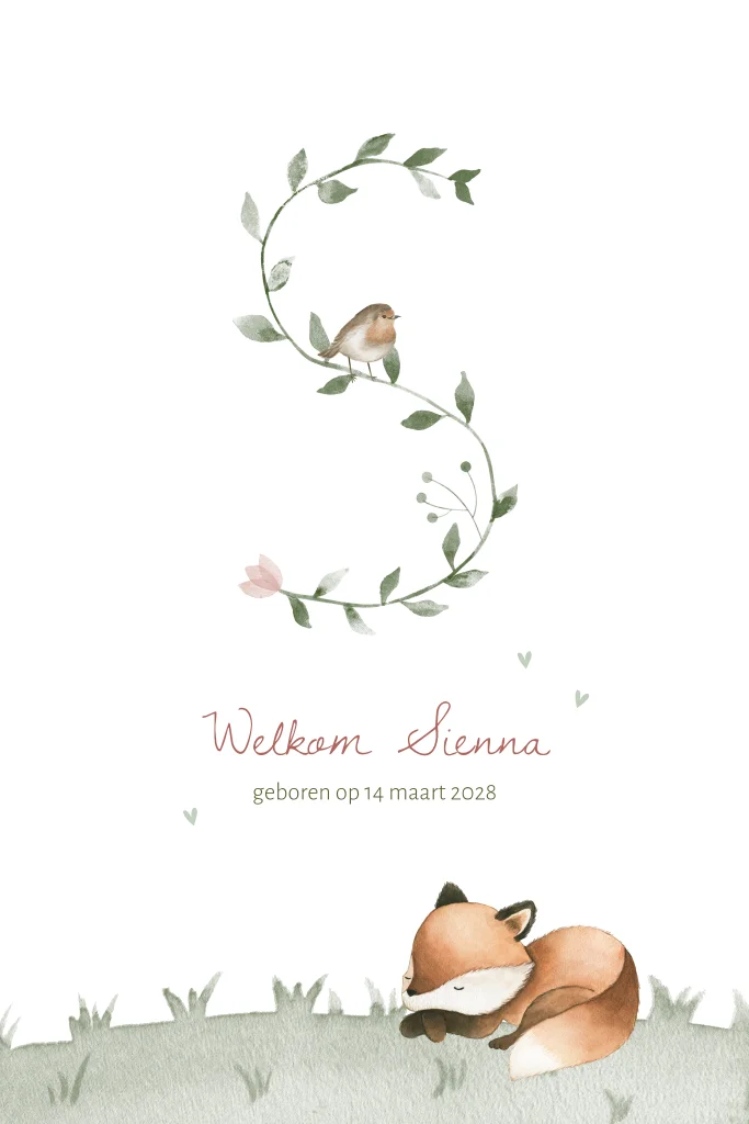 Geboortekaartje initiaal met blaadjes en slapend vosje
