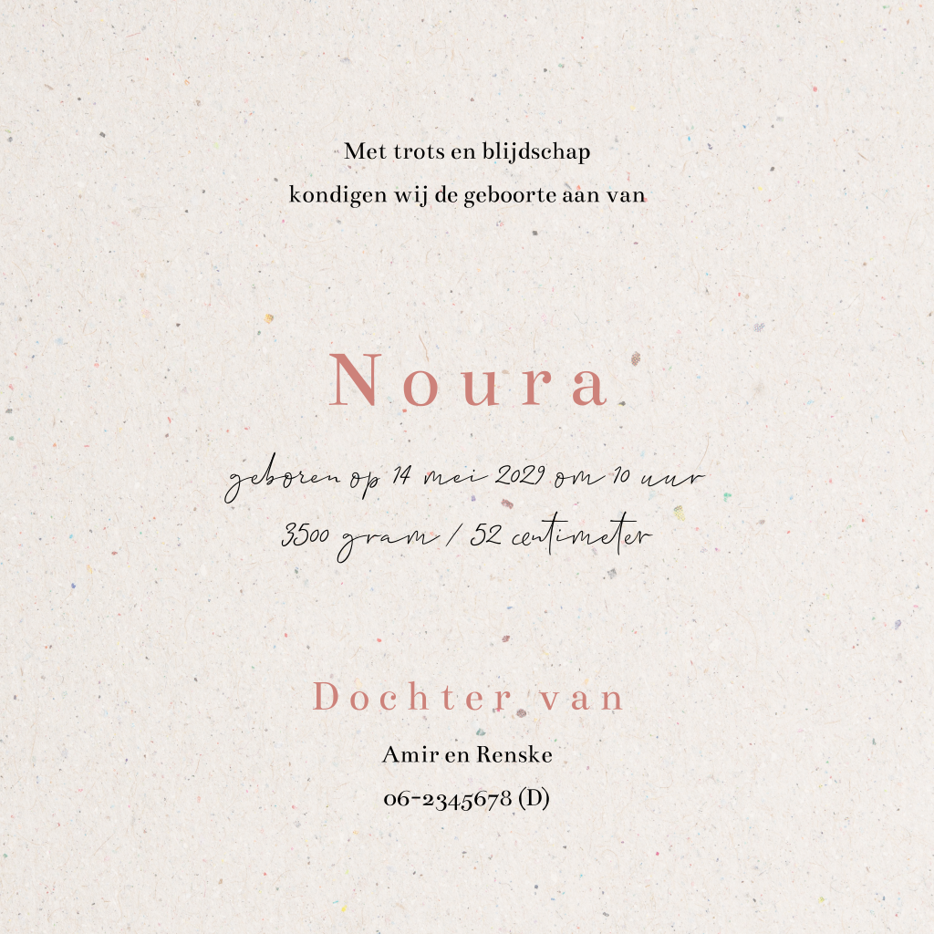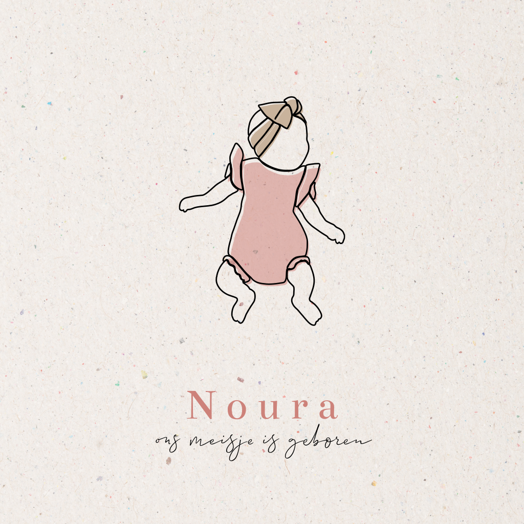 Ga voor dit beige geboortekaartje met papiertextuur achtergrond, lijntekening van baby meisje en roze typografie. Aan de binnenkant van dit lieve kaartje is ruimte voor een geboortegedichtje. Pas dit kaartje zelf aan in onze handige ontwerptool.