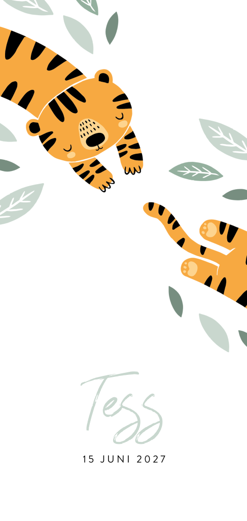 Speels geboortekaartje meisje met groene blaadjes en tijger