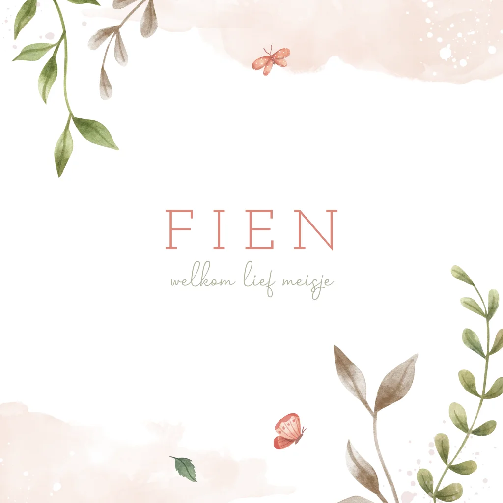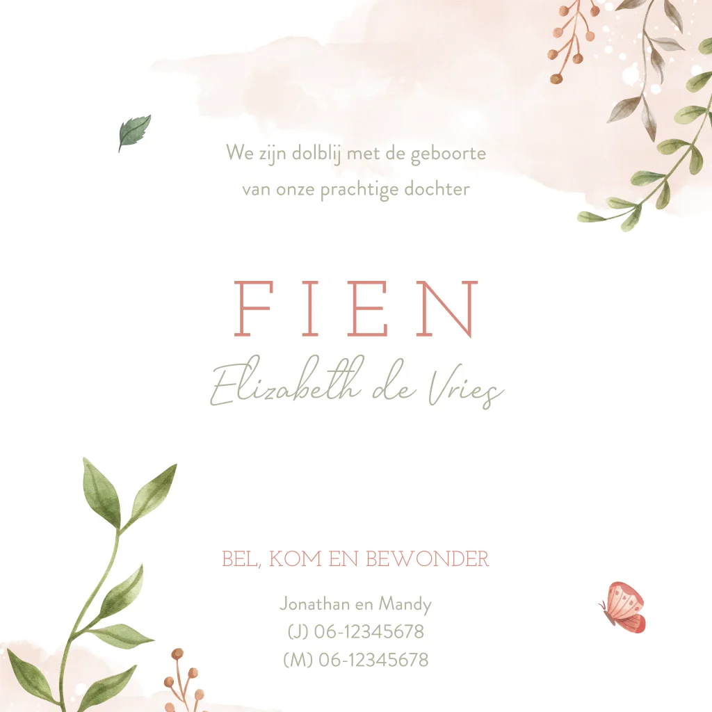 Botanisch geboortekaartje voor een meisje met bladeren van groene waterverf. Een lief en speels geboortekaartje voor een meisje met groene en zachtroze waterverf illustraties van blaadjes en vlindertjes. Aan de binnenkant van dit botanische kaartje kun je een foto plaatsen van je pasgeboren dochtertje. Pas dit kaartje eventueel aan in onze ontwerptool.