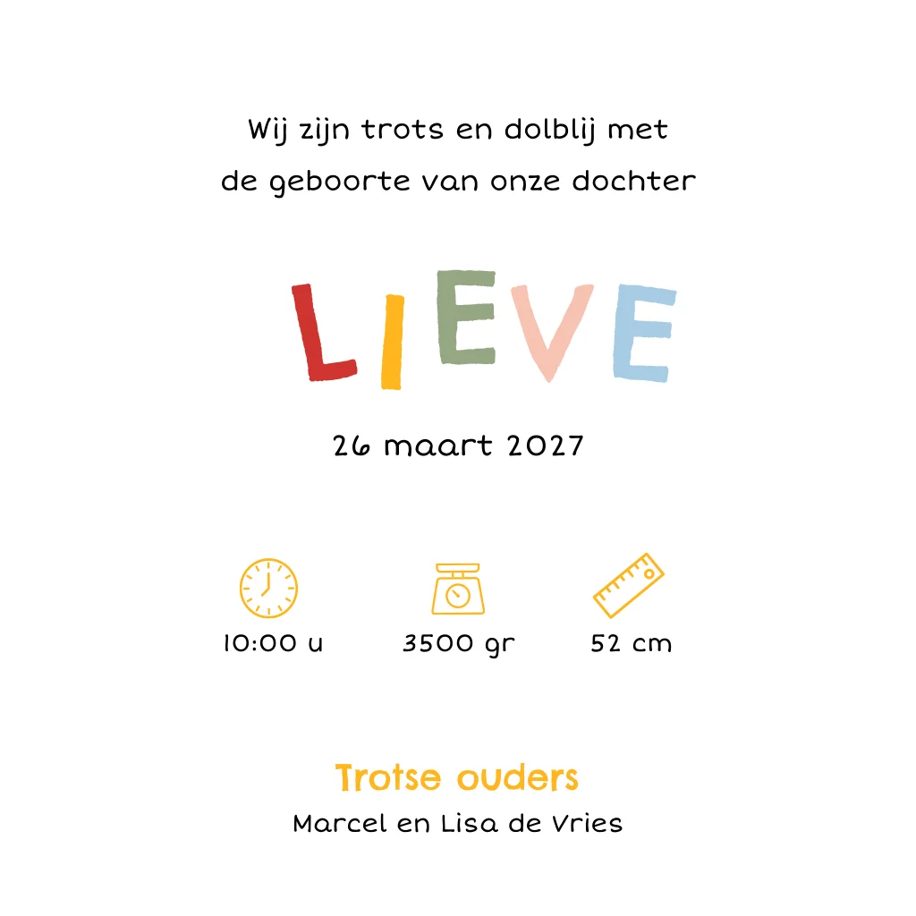 Op zoek naar een vrolijke geboortekaart voor je pasgeboren dochter? Dit leuke design heeft een vrolijke tekening van een olifant op de voorzijde. Uit zijn slurf blaast hij kleurrijke letters die de naam van je dochtertje vormen. In de kaart keert de olifant terug en is er ruimte voor een gedichtje en de geboortegegevens. Pas het kaartje naar wens aan en laat een drukproef komen. Zo kun je het resultaat in het echt beoordelen.
