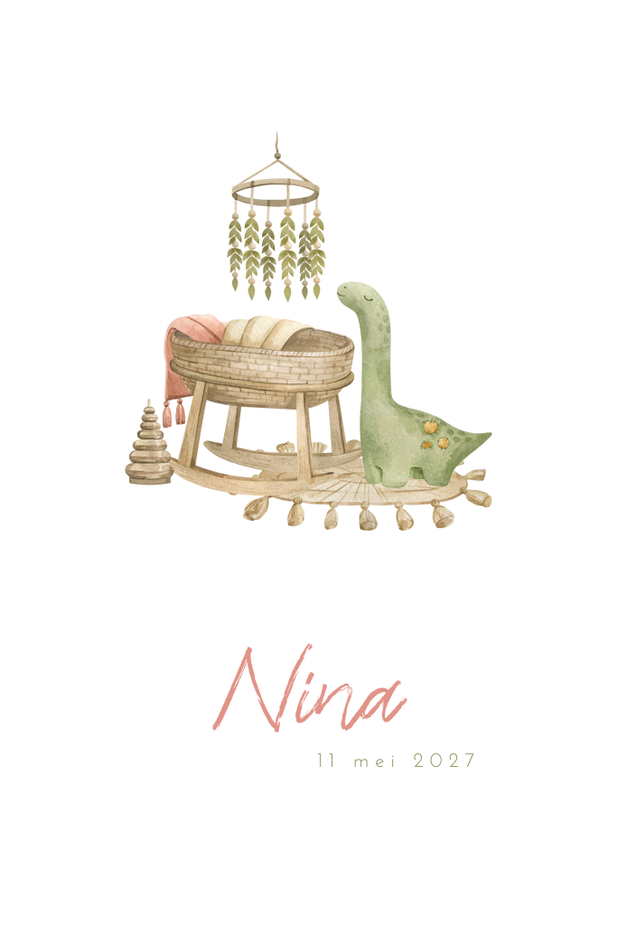 Dino's zijn superschattig en zeker deze baby brontosaurus met z'n lange nek past perfect op een geboortekaartje. En al helemaal in combinatie met het babykamertje van jullie kindje is zo'n dinokaartje een goede keuze. Hoe leuk is het dan om op dit minimalistische geboortekaartje beide elementen terug te laten komen.
