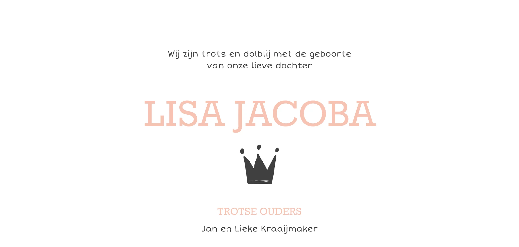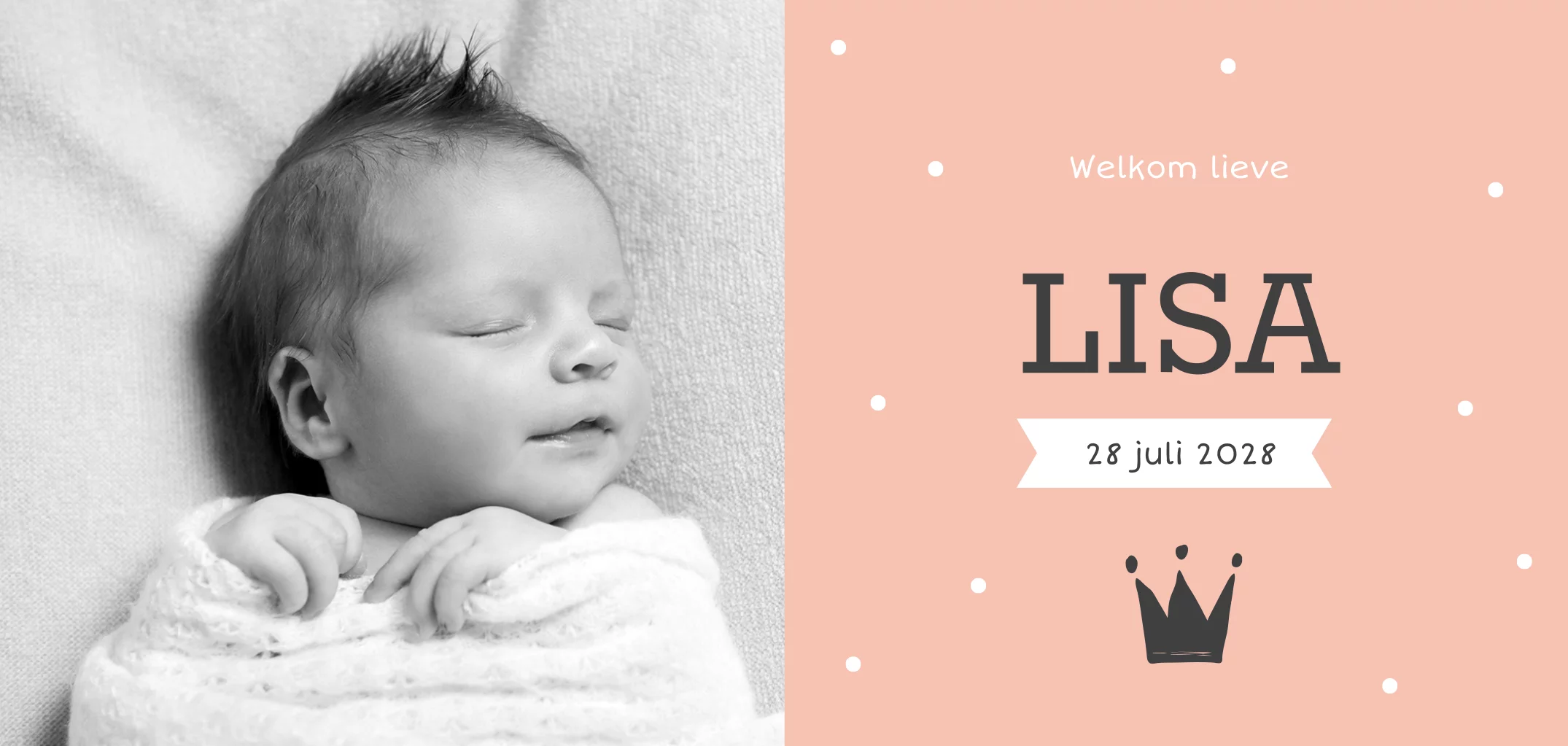 Langwerpig geboortekaartje voor een meisje met links een mooie foto van je pasgeboren dochter en rechts de naam met kroontje erboven.