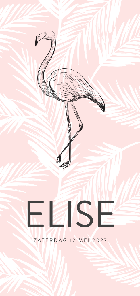 Strak geboortekaartje met roze achtergrond met witte palmbladeren. Op de voorkant zie je een mooie tekening van een flamingo. Achterop keert het patroon met bladeren terug en is er ruimte voor de geboortegegevens en alle andere informatie. Is roze niet jouw kleur? Pas de kaart geheel naar wens aan door de kleuren aan te passen. Bestel een proefdruk om het gedrukte resultaat te beoordelen.