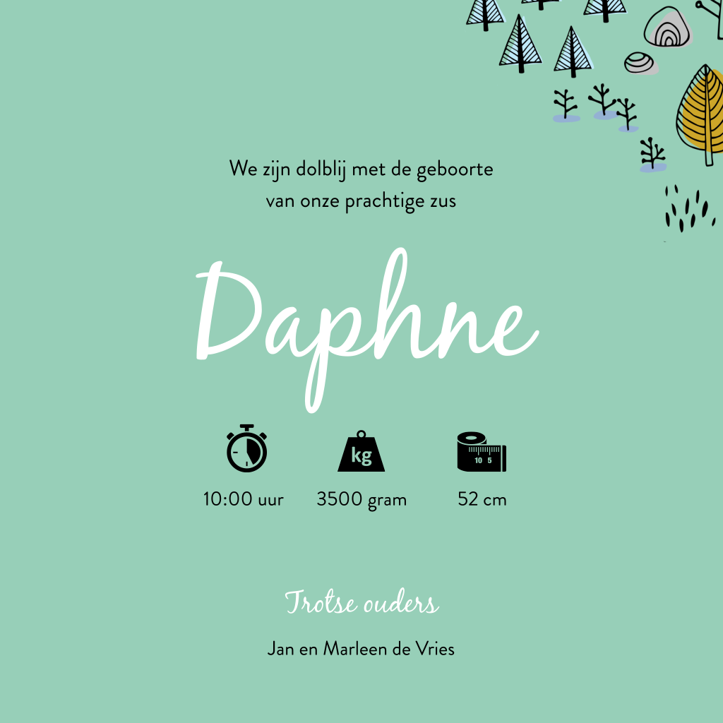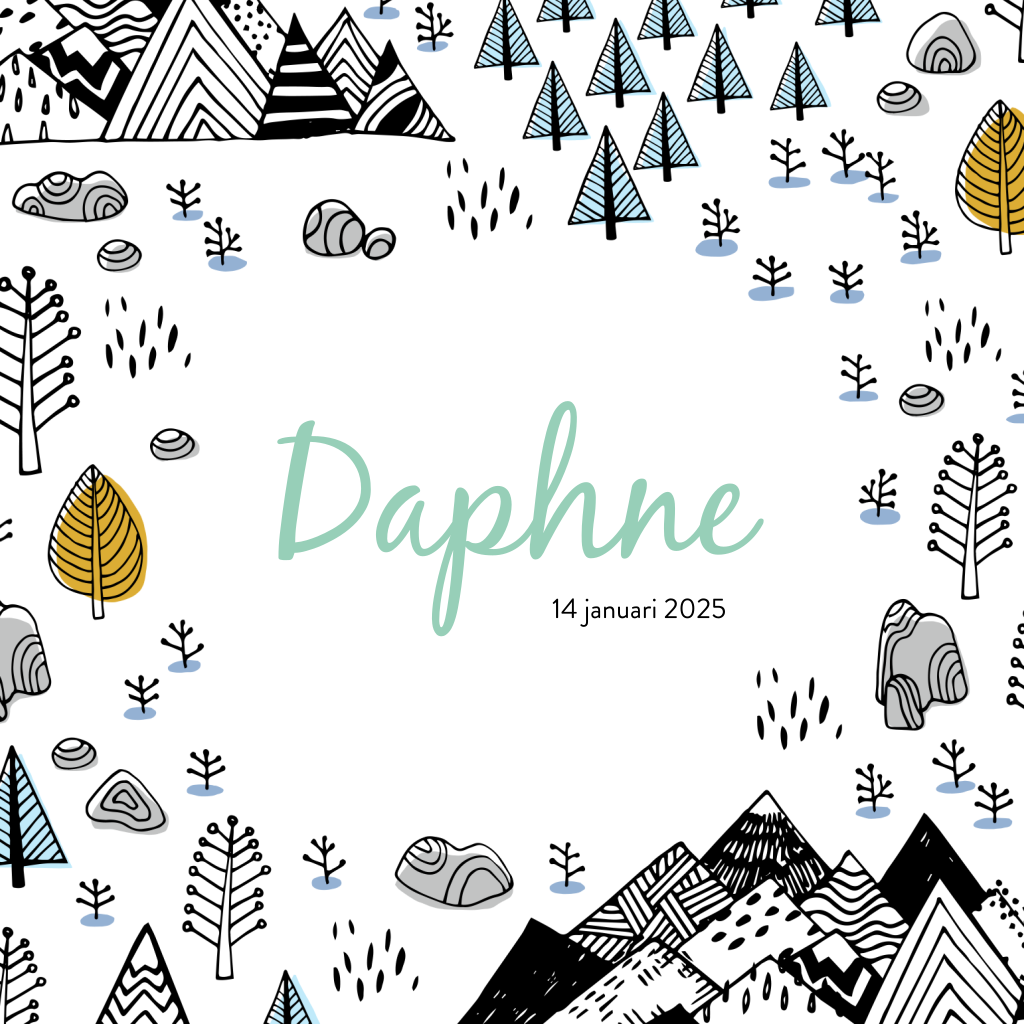 Winters geboortekaartje met getekend landschap en mintgroene typografie. Wordt je dochtertje in de winter geboren en ben je op zoek naar een speels geboortekaartje? Ga dan voor dit dubbele kaartje met geïllustreerde boompjes, bergen en stenen. De naam van je pasgeboren dochtertje komt in mintgroene vrolijke typografie voorop en aan de binnenzijde is er ruimte voor een lief gedichtje. Pas dit kaartje eventueel aan in onze handige ontwerptool. Bestel een proefdrukje om de kaart in het echt te kunnen bewonderen.