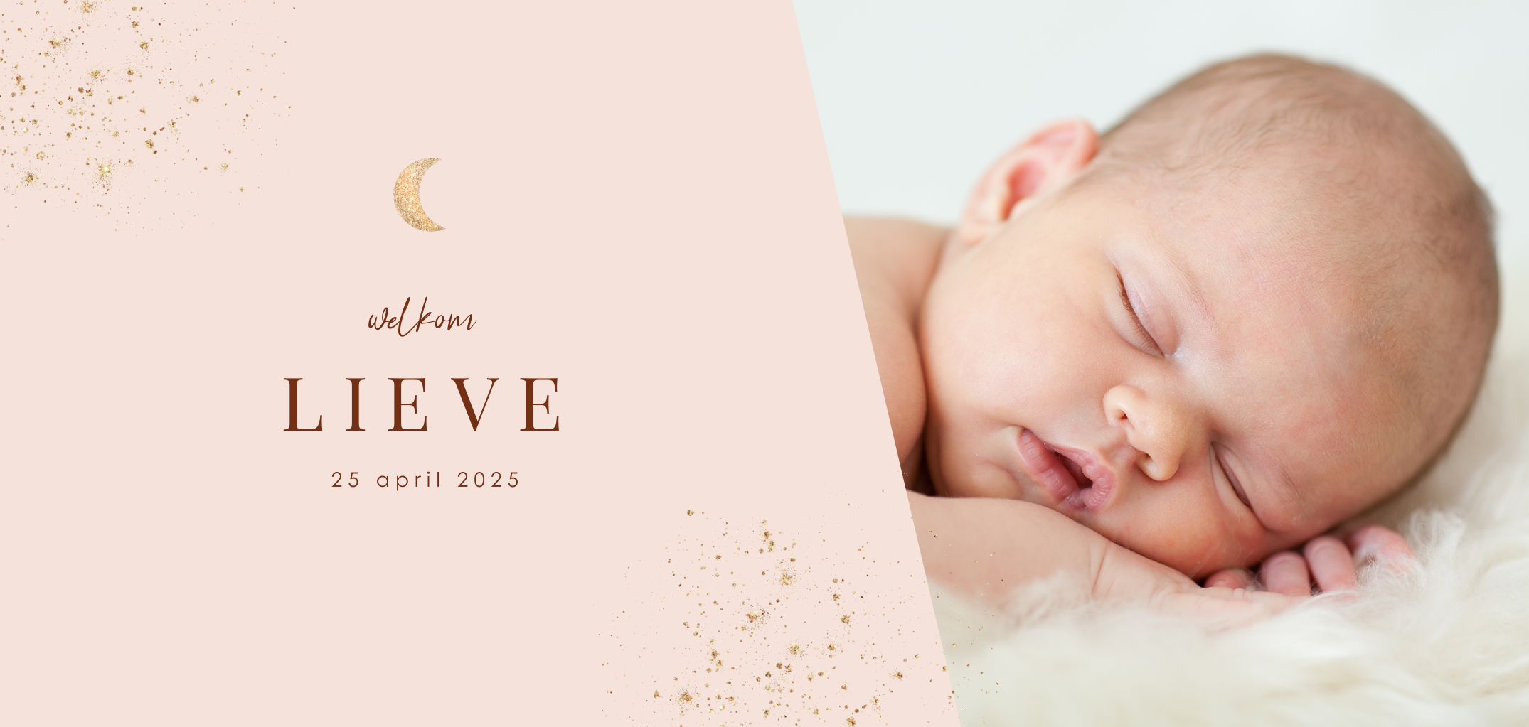 Een lief geboortekaartje in een zachtroze kleur met goudkleurige spetters en goudlook maantje. Op de voorzijde is ruimte voor een grote foto van je dochtertje. Op de achterkant komt het maantje terug en kun je eronder een kort gedichtje plaatsen. Liever andere kleuren of een lettertype aanpassen? Gebruik onze ontwerptool om je eigen draai aan dit geboortekaartje te geven.