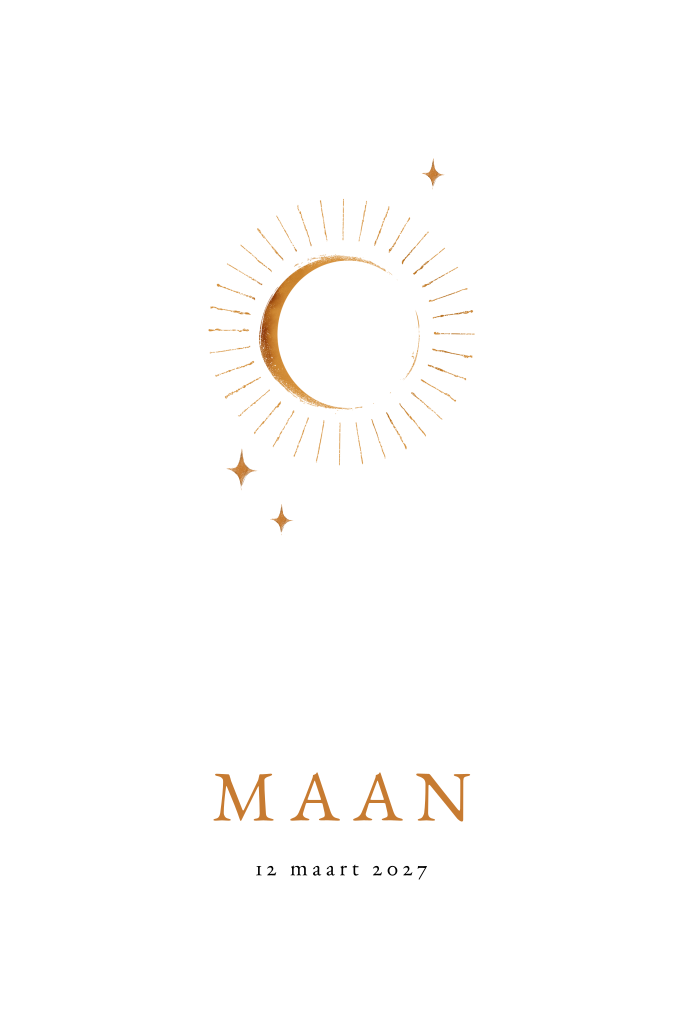 Enkel geboortekaartje met celestial thema. Geboortekaartjes met maantjes en sterren zijn helemaal hot en van nu. Zo ook dit mooie kaartje met roestrood maantje en flonkerende sterretjes. De achterzijde is compleet in terracotta kleur en heeft ruimte voor de geboortegegevens en jullie adres informatie. Pas de kaart naar wens aan en bestel een drukproef.