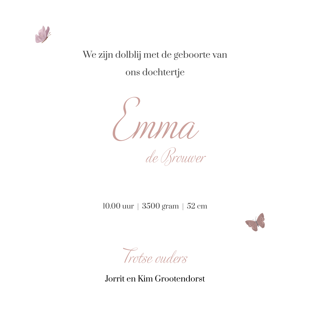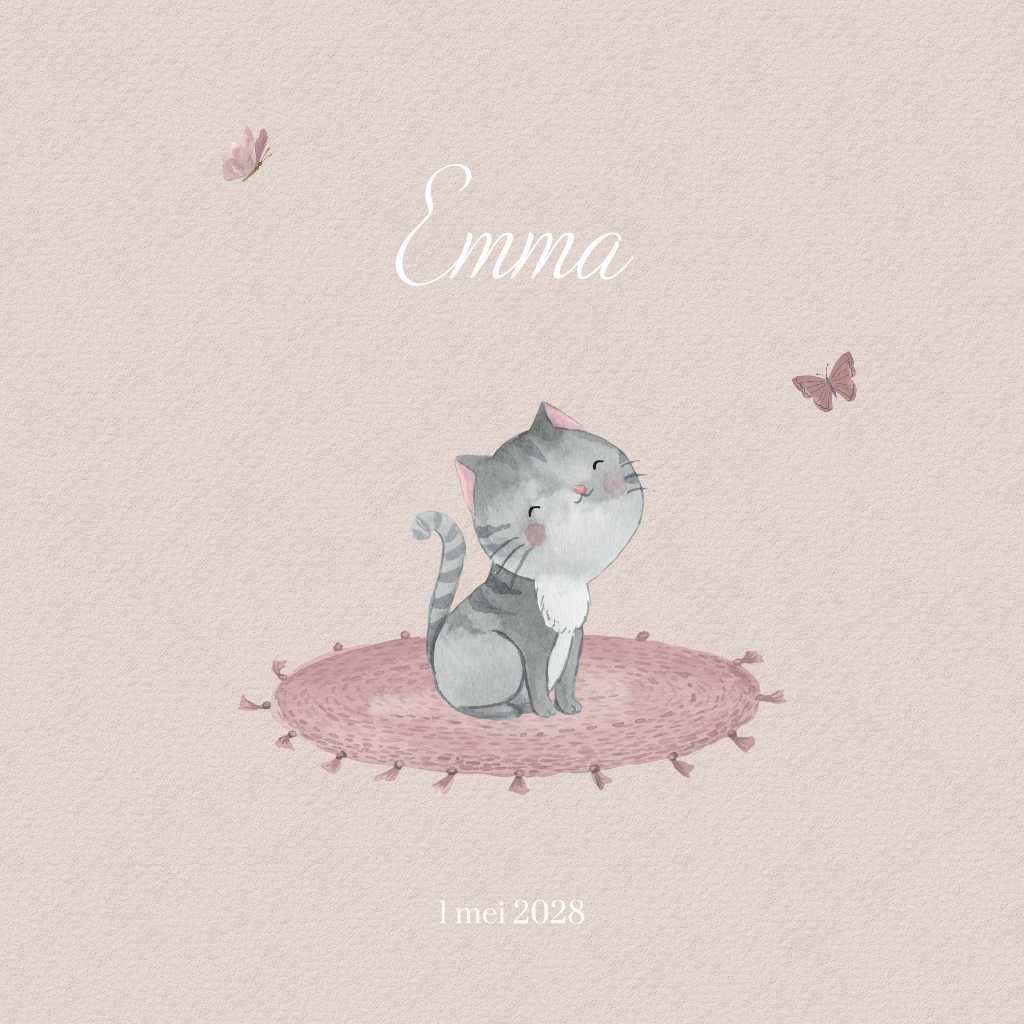 Op zoek naar een lief geboortekaartje met poes om de geboorte van je dochter aan te kondigen? Dit lieve geboortekaartje met grijs poesje op een roze kleedje is superleuk. Er vliegen enkele vlindertjes rond en aan de binnenzijde ligt het poesje lief te slapen.