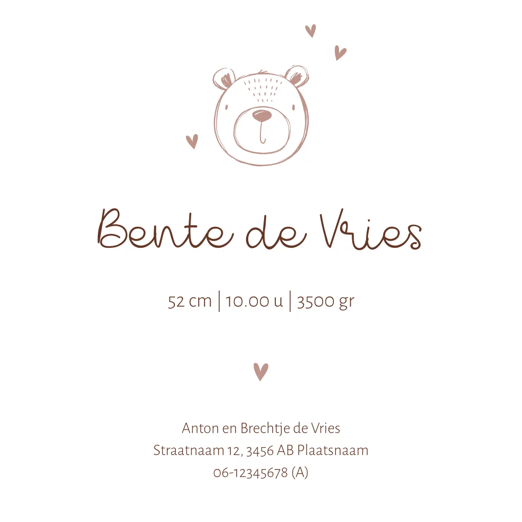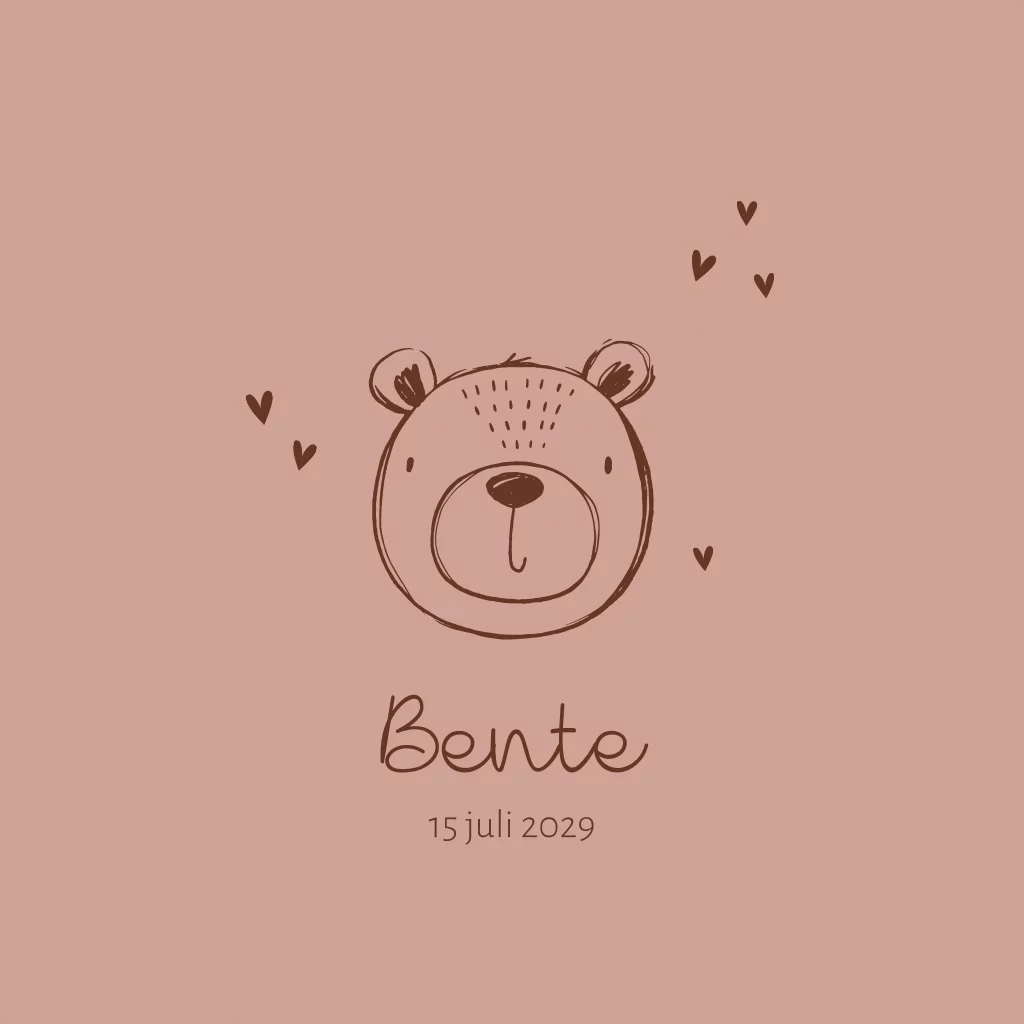 Een hip geboortekaartje voor jullie kleine meid! Het kaartje heeft een roze achtergrond met daarop een trendy getekend beertje. Het beertje wordt gedrukt in donkerrood zodat het echt een meisjeskaart wordt. Perfect voor een bijzondere aankondiging!