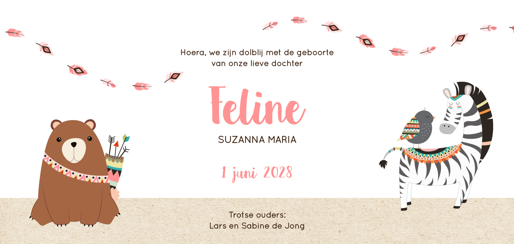 Bohemian geboortekaartje met roze tipitent omringd door roze veertjes en verschillende dieren als een giraffe, beer, zebra en vogel. Binnenin zit nog een schattig uiltje. pas de kaart naar wens aan en bestel een drukproef.