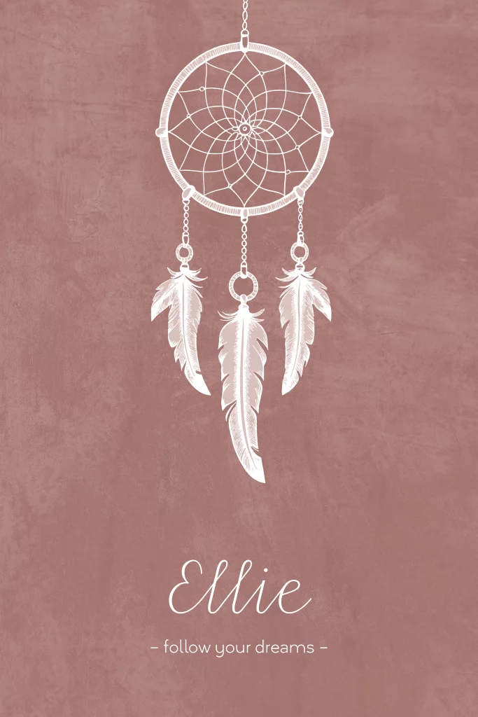 Stijlvol geboortekaartje met witte dromenvanger met veertjes op een taupe ondergrond. Onder de naam van je dochtertje staat de toepasselijke tekst 'follow your dreams'. Leuk boho ontwerp voor een meisje.